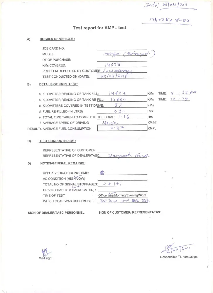 That the vehicle broke down in the middle of the road on 31 march 2008 and the car had just run approx 25, 000 km and it’s around 7 to 8 months old car. That the same had to be towed away and as told by the people at the workshop and Mr Banarjee the concerned manager at Mancheswar workshop that the car has manufacturing defect to its fuel pump, injector and rail. He showed me some iron residue, which had accumulated with the diesel which was taken out from the fuel pump and that those granules led to blockage of the injectors, which sprays fuel to the engine of the car. That these residues was from the grinding of the fuel pump and was not any way concerned to the diesel that was filled by me at the lenka petrol pump on the way to cuttack. That in no way as told by the concerned mechanic and Mr Bnarjee there was any problem with the diesel.