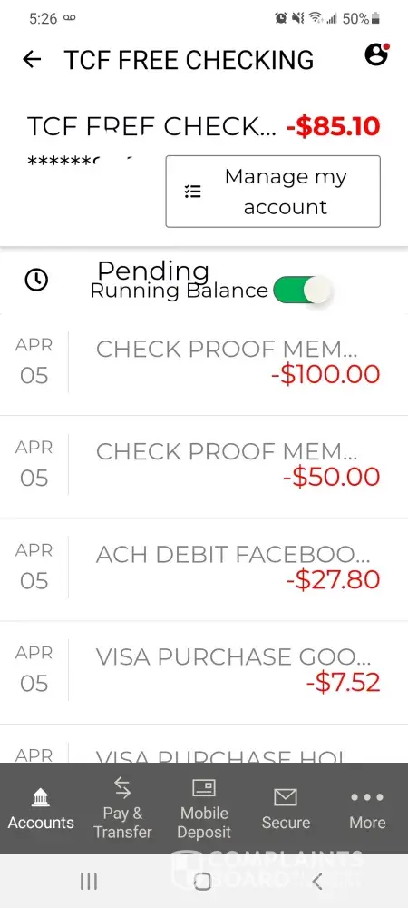 I send two payments to my credit card company on March 22nd. TCF said that it was processed and debited on March 26th at which time I had sufficient funds in my account. TCF then decided to remove the money from my account on April 5th even though they said it was removed on March 26th. On April 5th I did not have adequate funds and it resulted in TCF intentionally hitting my account with multiple bogus overdraft charges.