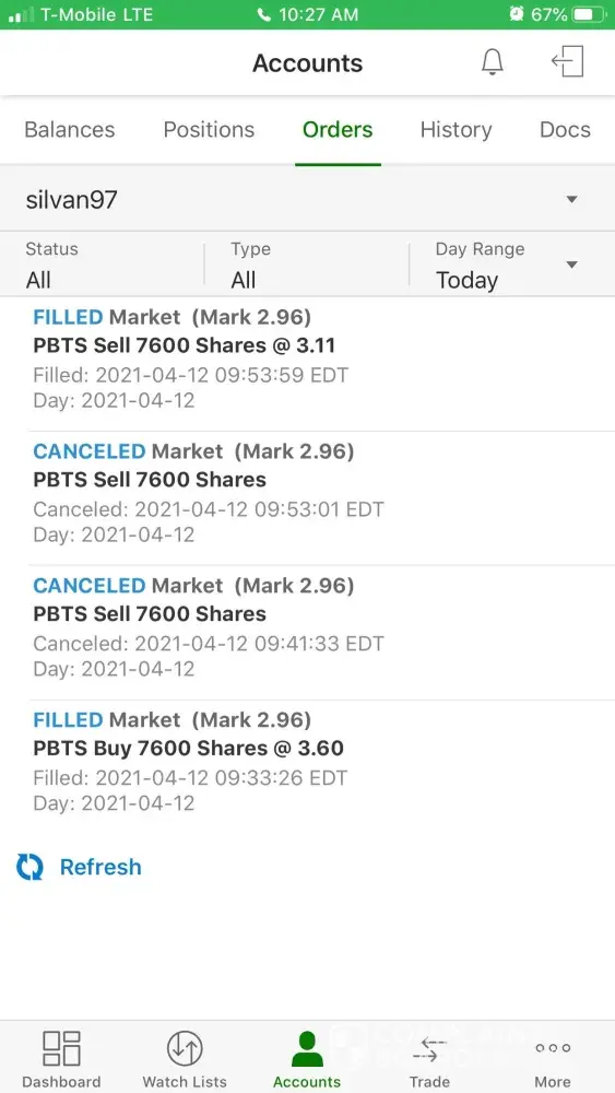 I've been a customer of TD Ameritrade since 2015, over 5 years. Over the years, I've made money and lost money. Unfortunately, I've lost more than I've made. In all that time, whenever I've had a loss that I was responsible for, I took the loss and moved on. I understand that you can lose money in the stock market. But on 4/12/2021, a strange thing happened. I purchased a stock on TD Ameritrade's website at 9:33 am, PBTS, and immediately after the purchase the price dropped. Darn, another loss. Oh well, I go to sell my shares and close my position. But nothing happens. I try to close my position again, the app just refreshes, takes me back to the sell screen and doesn't place the order. I do this a few more times but I keep getting the same thing. I jump over to the app on my phone to try and close and it just sits there loading. It won't allow the sale. I then jump back on the computer, pull up the Think or Swim app and try there but nothing. All this time the price is just dropping. Finally, after about 8 minutes, the order goes through on their website at 9:41 am. But the order's rejected. The price is still dropping. I try to close the position again but I get hit with the same thing that was happening before. The platform either kicks me back to the sell screen or the app just sits there. Finally after 12 minutes the sell order goes through again at 9:53 am. But again, the order to sell is rejected by TD Ameritrade. The price has dropped so low that I almost pass out. So again I keep trying and about 30 seconds later the third order goes through and TD Ameritrade finally allows me to close my position. It's now been over 20 minutes and I've lost a lot. I get TD Ameritrade on the phone and tell them the issue. A man by the name of Luke Hadley tells me that it's too bad but there's nothing they can do. I press them and they refuse to rectify the situation. Even though they see on their end that their system rejected my orders. So finally I get escalated to a man by the name of Jeffery Stezovsky. He says they'll agree to do a "price correction" and change my sell price to the price of my first rejection and says this will be done by a man named Nathan Maxwell. I tell them that this isn't good enough because my first rejection happened over eight minutes after I tried to close my position on three separate platforms. In that eight minutes, the price dropped over .27 cents. They tell me that they won't do anything more. I remind them that in the 6 years that I've been with them, I've never called and complained about any of my orders if I made money great, if I lost money then it was on me but in this instance, they're system prevented me from selling my shares and as result I get robbed by them. They said they see that but it doesn't matter. They said they can only go by the orders that show up in their system. I remind him that the two orders that they rejected were over 12 minutes apart and obviously I would continue to try and close my position during that time so something on their end must have been preventing me from closing my order all that time . They tell me that it's too bad. According to Mr. Stezovsky, they rejected my orders because they weren't able to sell all of the shares at the same price so they were afraid I'd lose money. But that doesn't make sense because if you reject my attempts to sell the shares while the price is dropping and don't even tell me the reason, then I will lose money anyway. Also, on almost every order where I purchase or sell shares at market price, all the shares don't get purchased or sold at the same price. They almost always fill my order at different prices. That's because I chose, Market Price and not Limit. They know this. If you buy or sell at market, then they will buy or sell your shares at whatever the market price is at the time of the purchase or the sale. That's always how it works. But for some reason today, they didn't want to sell at market because it would make me lose money so instead they rejected my orders so that I lose money? It makes no sense and it's clear that TD Ameritrade has worked to rob me. I want my sell price corrected to the price that I tried to sell it at the first time and then I'll take my money and leave TD Ameritrade alone. TD Ameritrade knows that timing is very important when trading and all the time it took me to navigate their failing system resulted in a huge loss for me but a big gain for them. And again, this was because they're system was glitching so I shouldn't be penalized for their error. First the system wouldn't allow my order to go through and when it finally did allow it, they system canceled the orders on it's side and all that time, while their system was malfunctioning, I was losing my money to them.