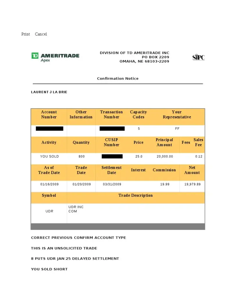 On 1/16/09 TDA confirmed in writing multiple times that I shorted UDR at $25/share and assigned it Transaction # XXXXXXXXXXX and CUSIP #XXXXXXXXX. $19, 979.89 was credited to my account.