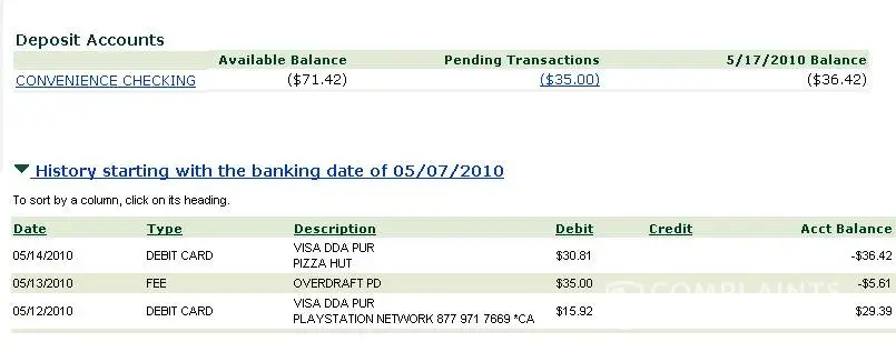 Ridiculous. I also have a pending 35 dollar overdraft fee putting me down to negative 71.42. Before I went to get pizzahut, I saw the avaliable balance. Now this is the AVAILABLE balance, not the balance for the day and it showed me that I had $45.31! so I said. ok, pizzahut for 30 bucks? I'm good. Went out to get pizzahut and then the Playstation network that wasn't even pending ever! just goes through out of no where. From the looks of it, I am getting charged an overdraft fee for pizzahut because I already had -5.61 in my account because I was overdrafted for no reason before getting pizzahut. This makes on sense and I want to switch banks badly. 2 overdraft fees. one that I wasn't aware of, and the pending one I shouldn't even be getting!
