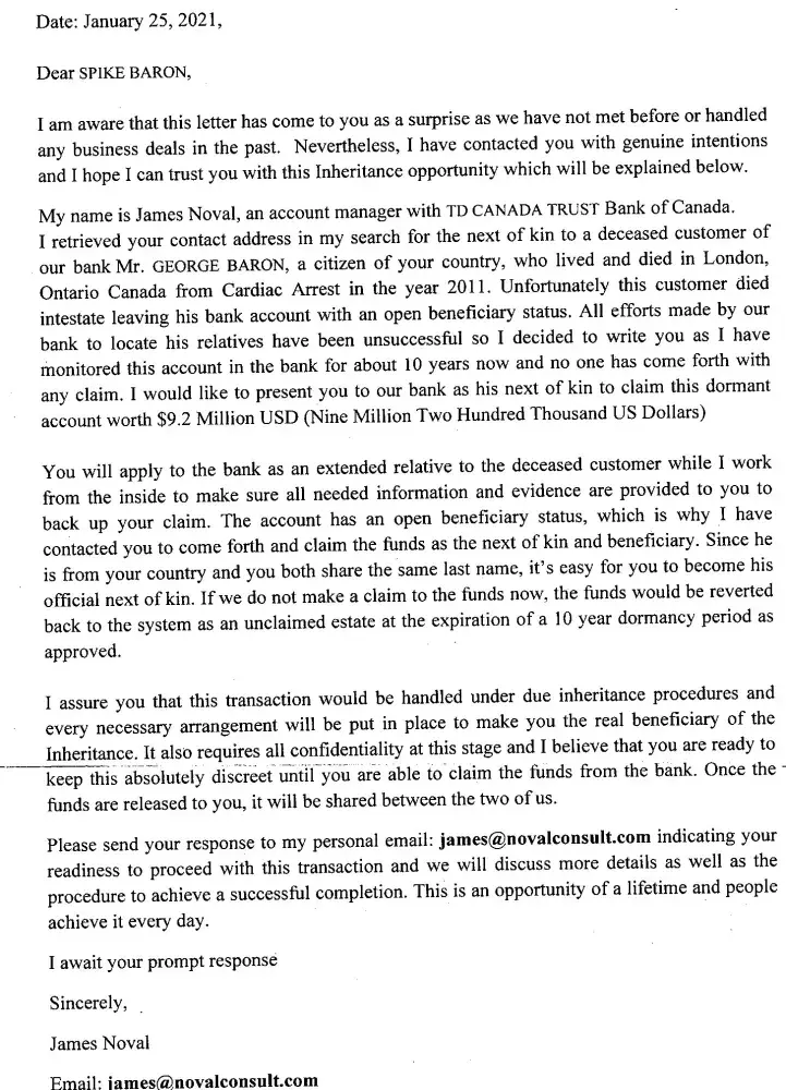 I received a letter from James Noval [protected]@novalconsult.com not a real domain name. Who says he is an Account Manager at TD Canada Trust Bank of Canada. Saying he is in charge of a Bank Account of a Deceased customer with my last name, George Baron, which I don't have anyone in my family by that name. And that since there is no beneficiary for this account and I had the same name; would I like to appear as his relative to split the $9.2 Million dollars in the account with him, Mr Noval.