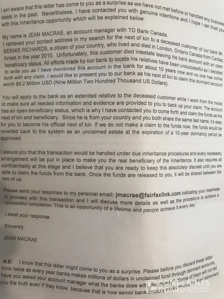 Received a similar letter from Jean Macrae, jmcrae@fairfaxlink.com. Clearly a scam but I hope a less suspecting person wouldn’t fall for it