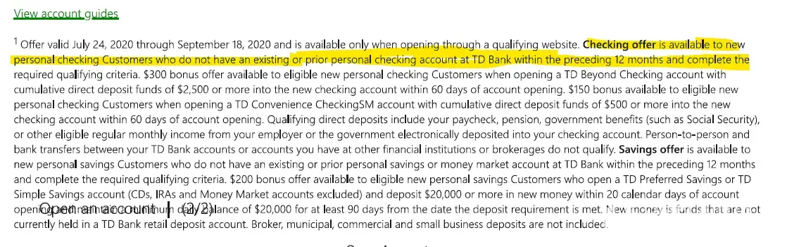 TD Bank is refusing to honor the terms of the promotion and pay a bonus. I opened a checking account at TD Bank on 09/14/20.They were offering a sign up bonus of $300 if certain criteria were met, see attached terms and conditions. I met the criteria and when no bonus posted within the specified timeframe, reached out to the bank. I was informed that I wasn't eligible for the bonus because I had previously earned a bonus in 2018 and terms of the offer state 'one bonus account per Customer and cannot be combined with any other offer'. I countered by pointing out that terms also state 'Checking offer is available to new personal checking customers who do not have an existing or prior personal checking account at TD Bank within the preceding 12 months'. This language is not ambiguous and clearly I'm eligible because last time I had an account was 2018. I was again told that the account is not eligible for the offer. I'm attaching the exchange with the bank rep and offer T&Cs.