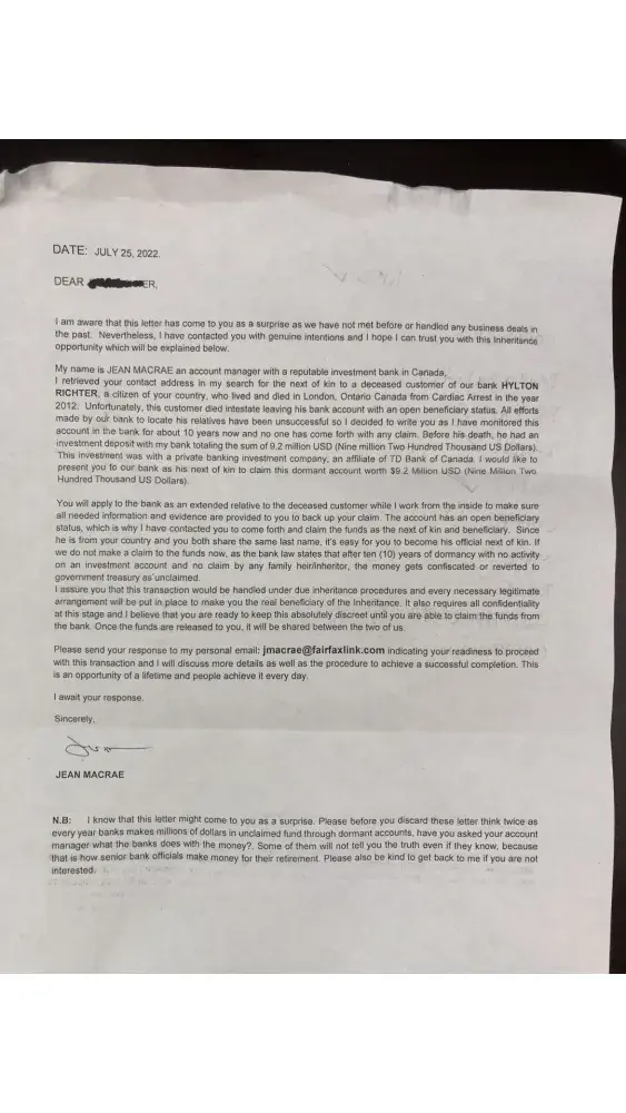 Received potential inheritance scam letter/transaction fraud
