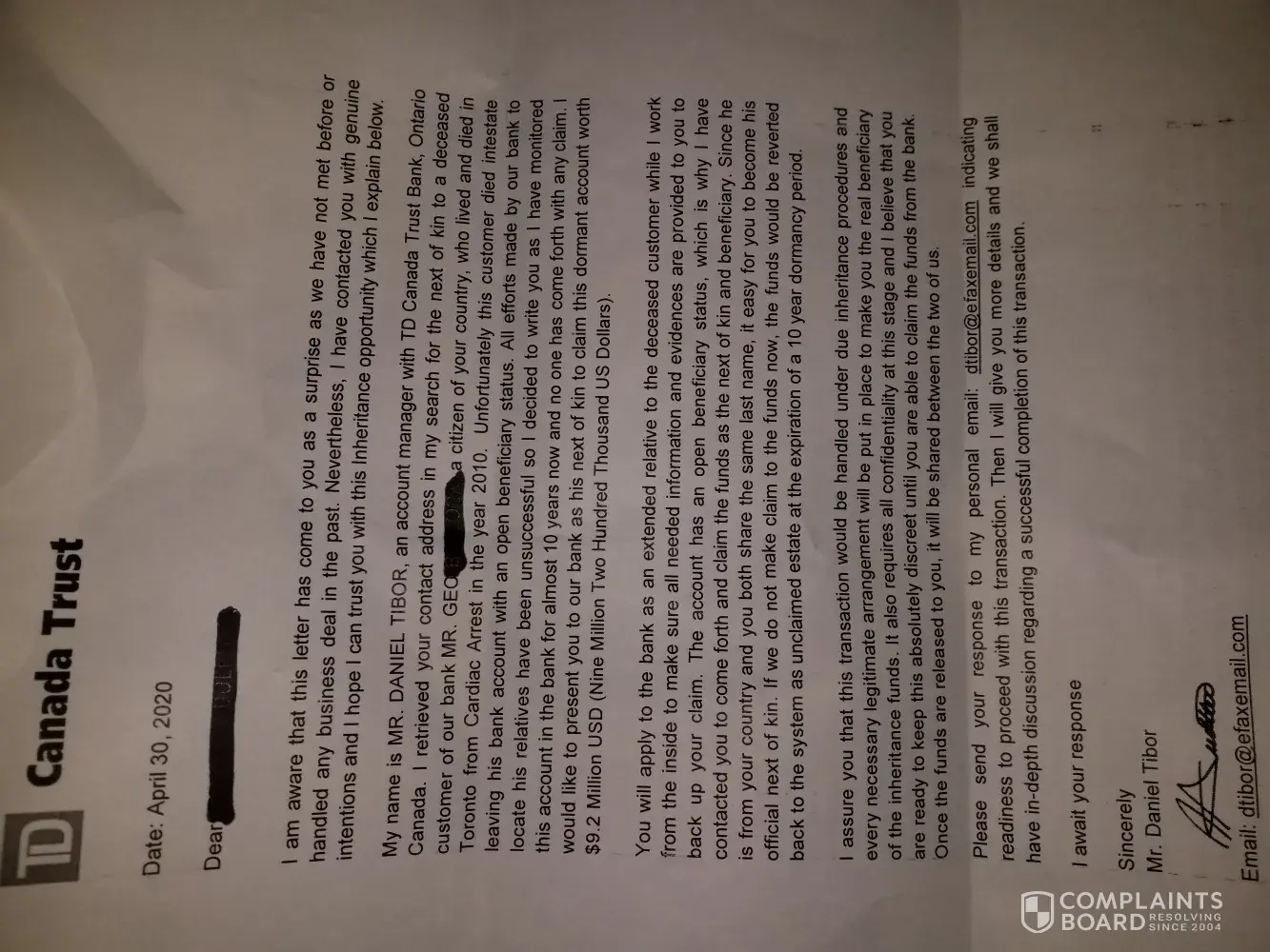 I received a letter today, July 11, 2020, which was dated June 17, 2020 stating a George Frink has died without an heir. Mr. Daniel Tibor of TD Canada Trust, according to his letterhead, which was photocopied with no information except the name of the bank, said he has tried to find relatives for 10 years to no avail, so he was writing to ask me to apply for the 9.2 million dollars supposedly sitting in this bank. There was no address or phone number listed on the letter.
