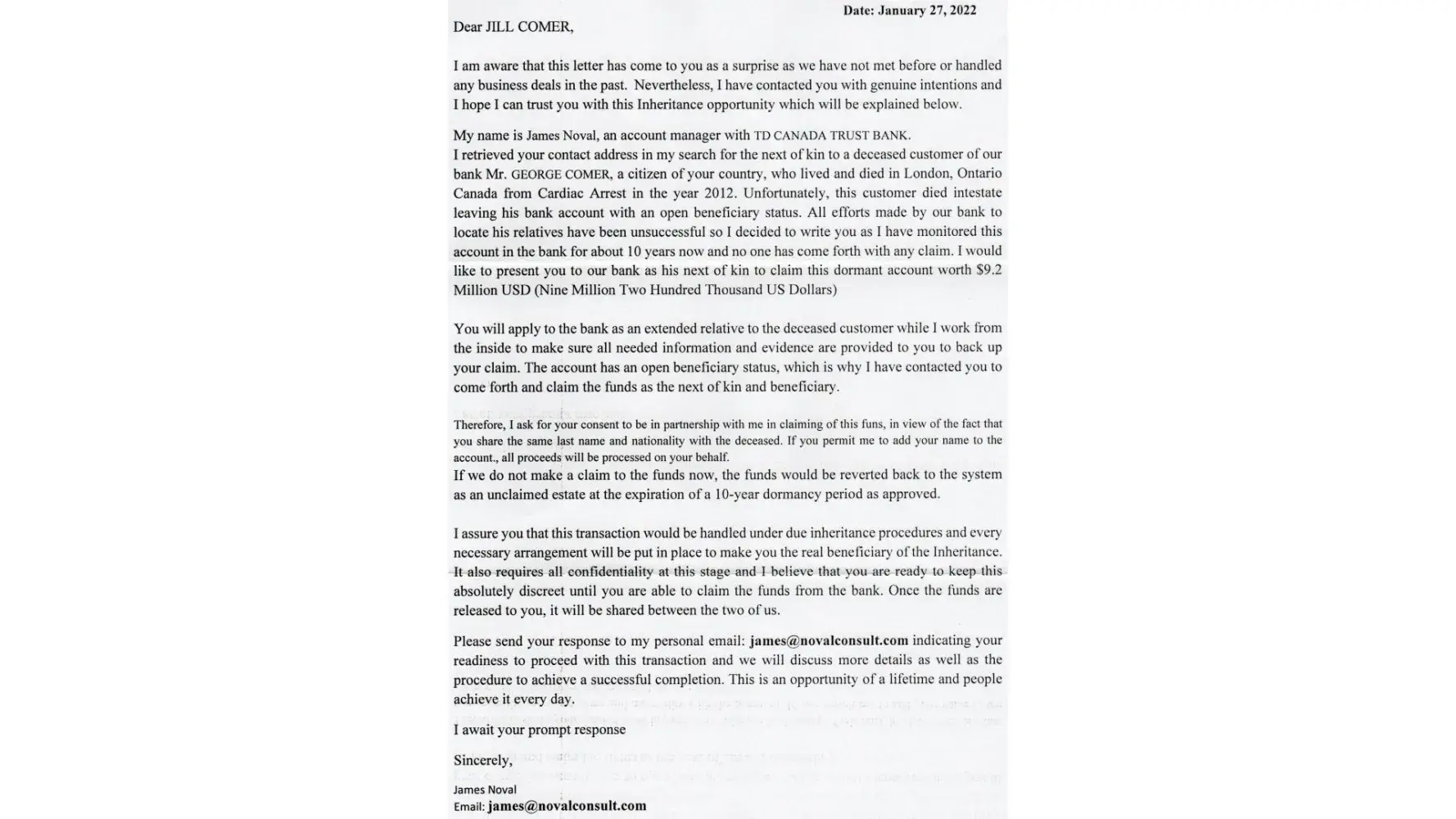 TD Bank Fraudulent Letter Received in Mail Regarding Inheritance Amount