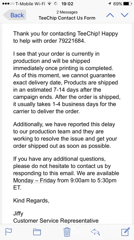 Ordered three 'I am Groot' T-shirts from a facebook link to TeeChip. Got an email saying they arrived. But nothing did. Contacted them about it. They said they couldn't help. Then when I asked from Proof of Delivery, I get that their customer support email is full and they can't receive any more messages there. No other way to contact them. They are Scammers. Stay away.