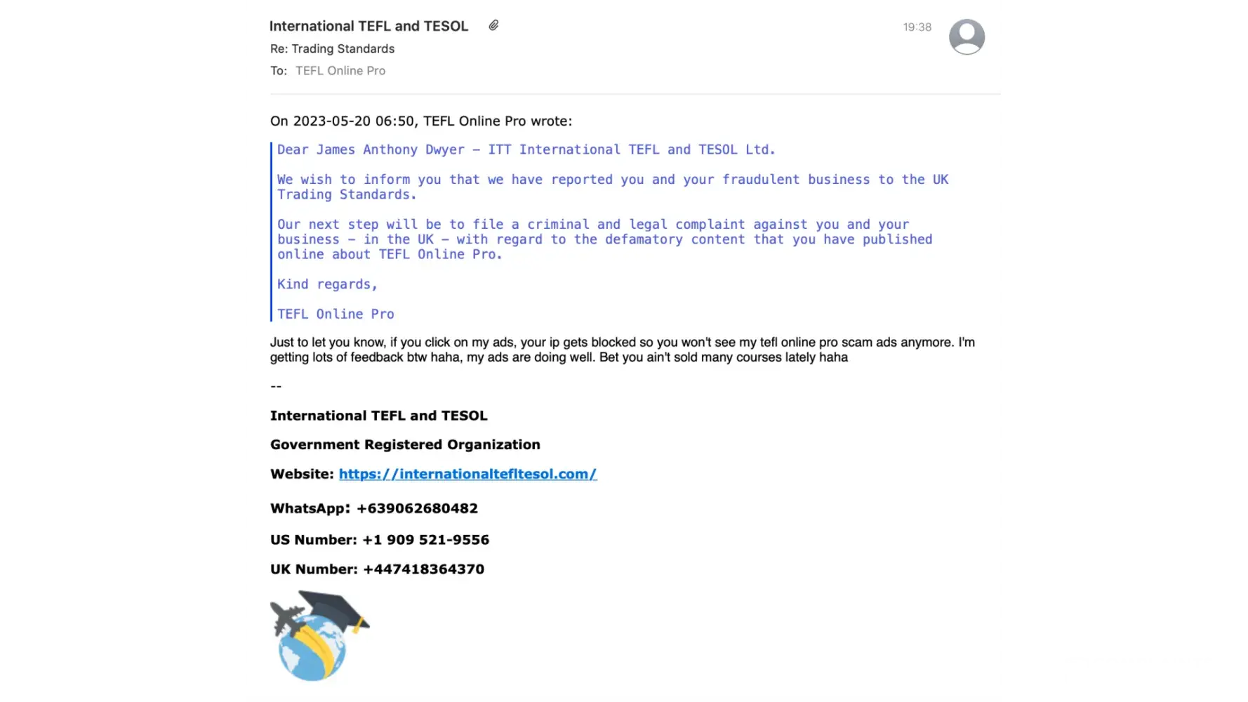 A screenshot of an email is attached, showing proof of this and showing the typical response from the owner of ITT International TEFL and TESOL Ltd.
