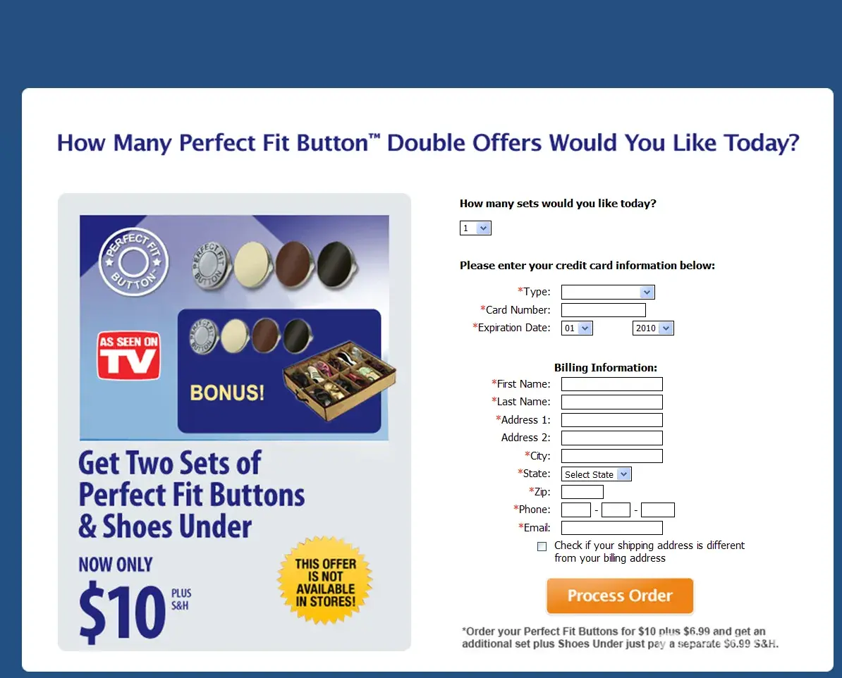 I saw a commercial for Perfect Button (product description irrelevant). I went on to the Net to order it. On the TV commercial they made a point of $10, double the order for payment of shipping only, blah, blah.