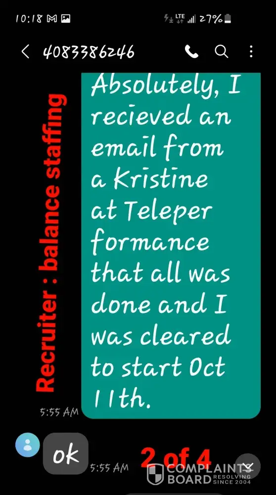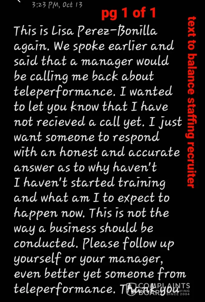 I had gone through the entire application and onboarding process including, background check and work equipment recieved. I was emailed that I was fully cleared to begin training on October 11, 2021. The only step needed prior to training was a "tech check". By Friday Oct 8, I had not recieved anything regarding the tech check nor a link to start my virtual training. I email several people at Teleperformance more than once. I called and text a Recruiter twice from balance staffing agency and was told a manager would call me, no one ever did. I joined a zoom conference on 3 different occasions that was managed by Balance Staffing Agency that was held on weekdays for questions or help with onboarding. I was told then that the "tech checks" were behind schedule but that I should hear from them anytime now. I never did. Bottom line is I turned down 2 other offers in order to join Teleperformance. As of Oct 19, not one single person has ever made any attempt to contact me. As a result of no one answering any of my many requests for answers, I never was able to start my training/employment with Teleperformance. I have suffered a financial loss and just as important, my time wasted. I now have to begin my employment search all over again wasting even more of my precious time causing more financial hardship. I am asking for Teleperformance to compensate me for the week of Monday, October 11, 2021 to Friday, October 15, 2021 to ease the financial hardship I am experiencing because of their actions. The compensation I expect would be at the hourly wage set in my offer letter for total 40 hours for tle week. I consider myself no longer an employee from October 15, 2021.