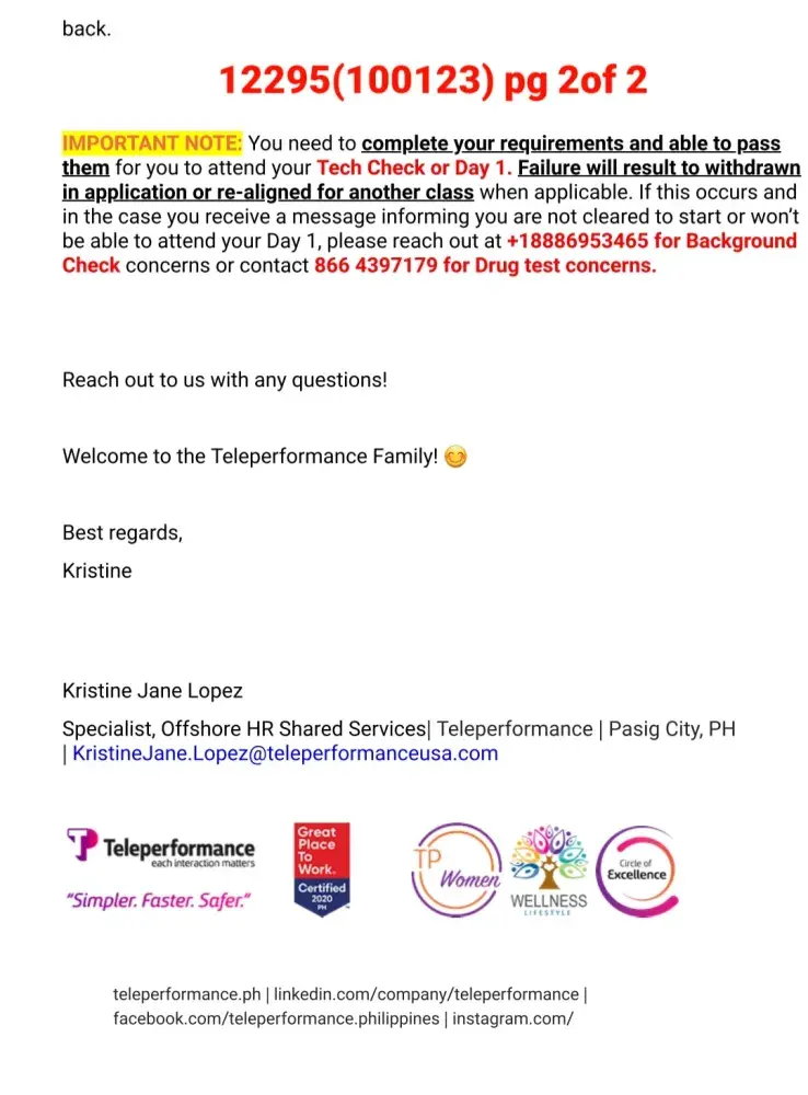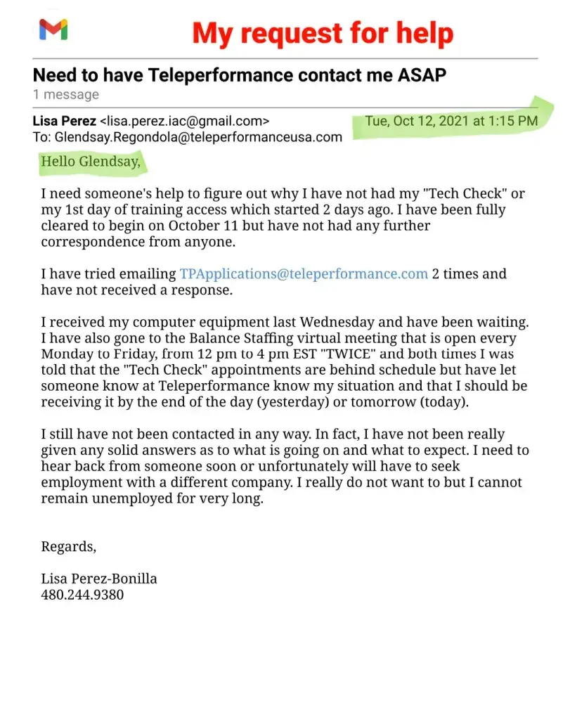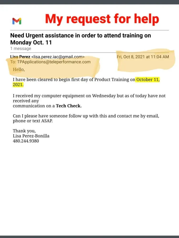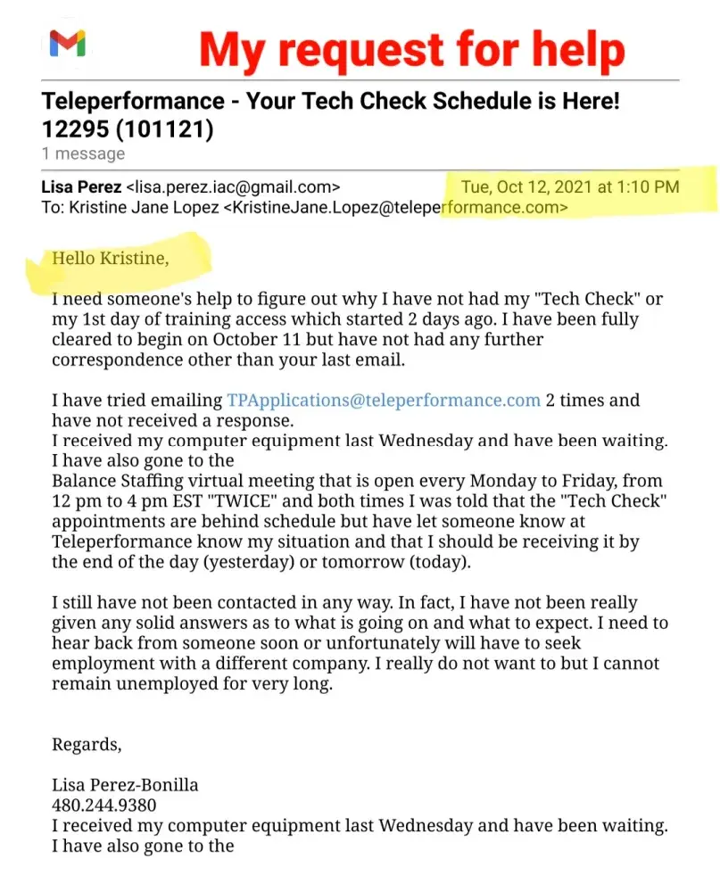 Sorry to hear you are going through the same problem. If you want to get any response from them I would say to post your situation on "Glassdoor ." I did post my complaint with them and got a canned response stating that they "care deeply" and to contact them to resolve the matter. Their response was as worthless as the employment offer I accepted. The phone number they provided was a recording of one ad after another asking for a response of "yes" I want more information or decline it, just to hear another ad. After I declined every ad, it drop me from the call. I tried 3 times to reach someone and got the same result everytime. All I could do was email them (again with the email they provided on glassdoor) that included all the documents I have posted here. About 2 weeks later I recieved a reply about my email that said "This is noted. I already forwarded your concern to the appropriate team. Please expect them to take action as soon as possible." Well, that was 6 days ago and have not heard from anyone yet. So now I have THEIR computer taking up space in my office. I do have a return shipping label to send it back but I am not going to send it to them until I hear from someone about my problem with their company. For clarification, I'm not keeping their computer out of spite. I am keeping it out of concern that they will say they never recieved it and claim that I must repay them for its value. If it were any other company, I would have sent their equipment back right away but then again, I don't think any other company is as incompetent as Teleperformance.