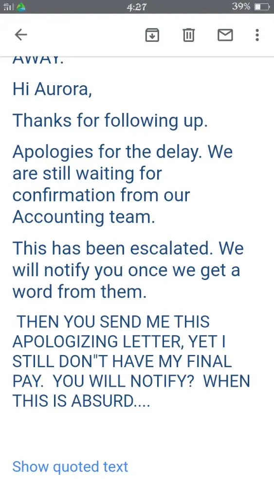 Read full complaintCompany has not released my final pay