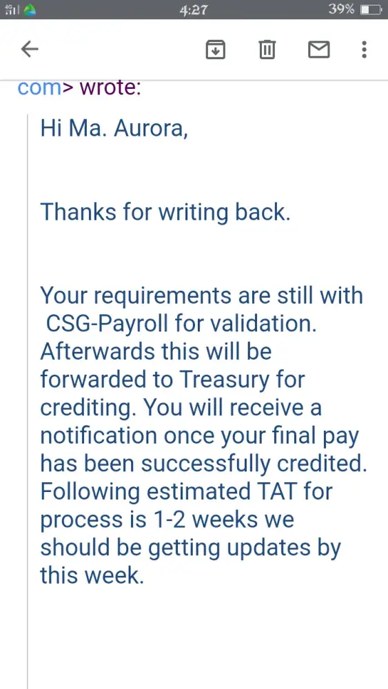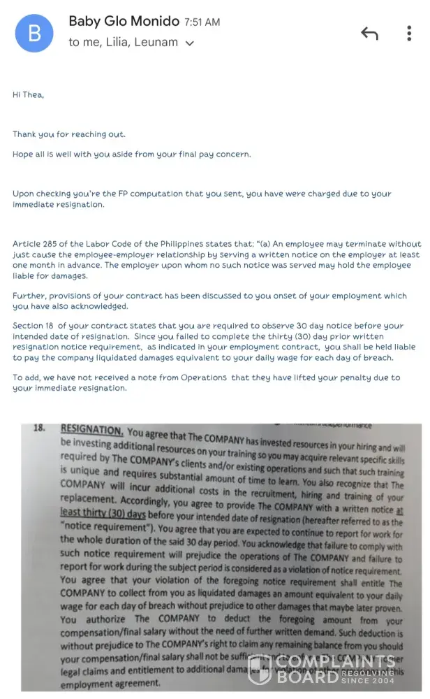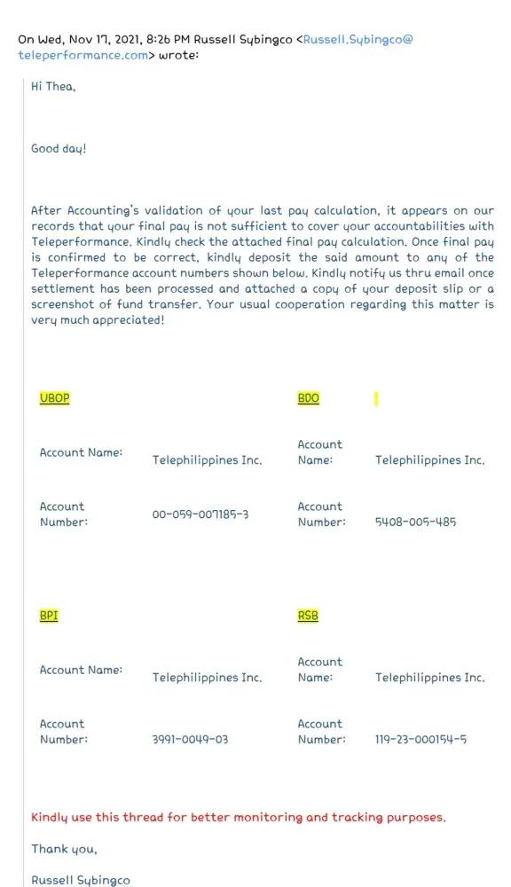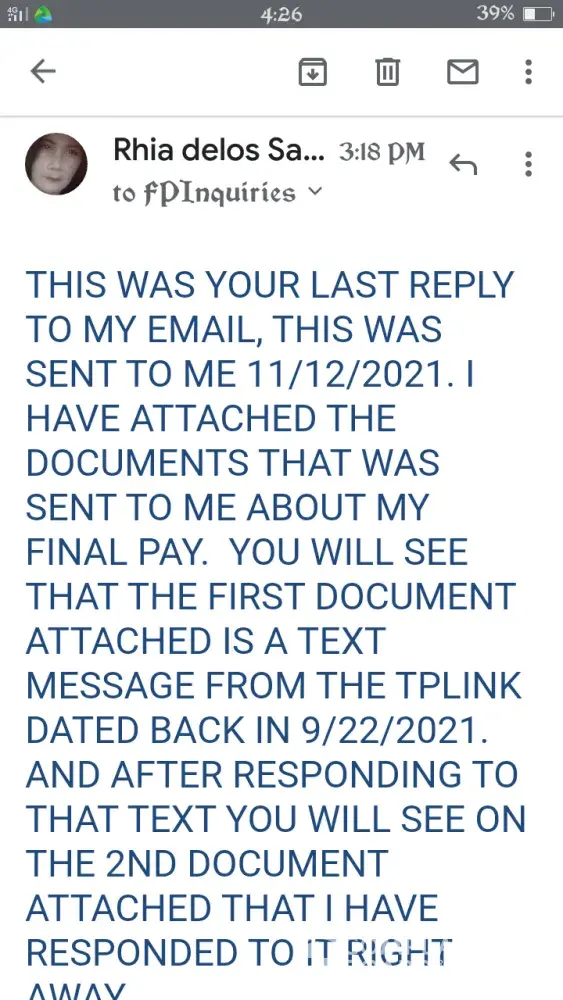 I left Teleperformance around March of this year. I have not processed my clearance right away because of the pandemic. Since then I knew that I was not expecting I was going to get my final pay. Until they have sent me a text message (see the document attached) from Teleperformance saying that my preliminary final pay computation is ready. So I had responded to the text since I'm unemployed my family could really use the money. Besides I worked for it. I know that their computation is wrong because the 3 days that I was sick and I had gone to the doctor in which I submitted the original fit to work letter to the site clinic and did not make myself a copy that's why I did not mention it any longer to them cause I don't have a copy of my fit to work. But I was so sure that my superviaor said that I can use the sick leave benefit that we automatically get on the 3rd or 6th month working for the company. Up to now they have not forwarded my final pay to my payroll account.