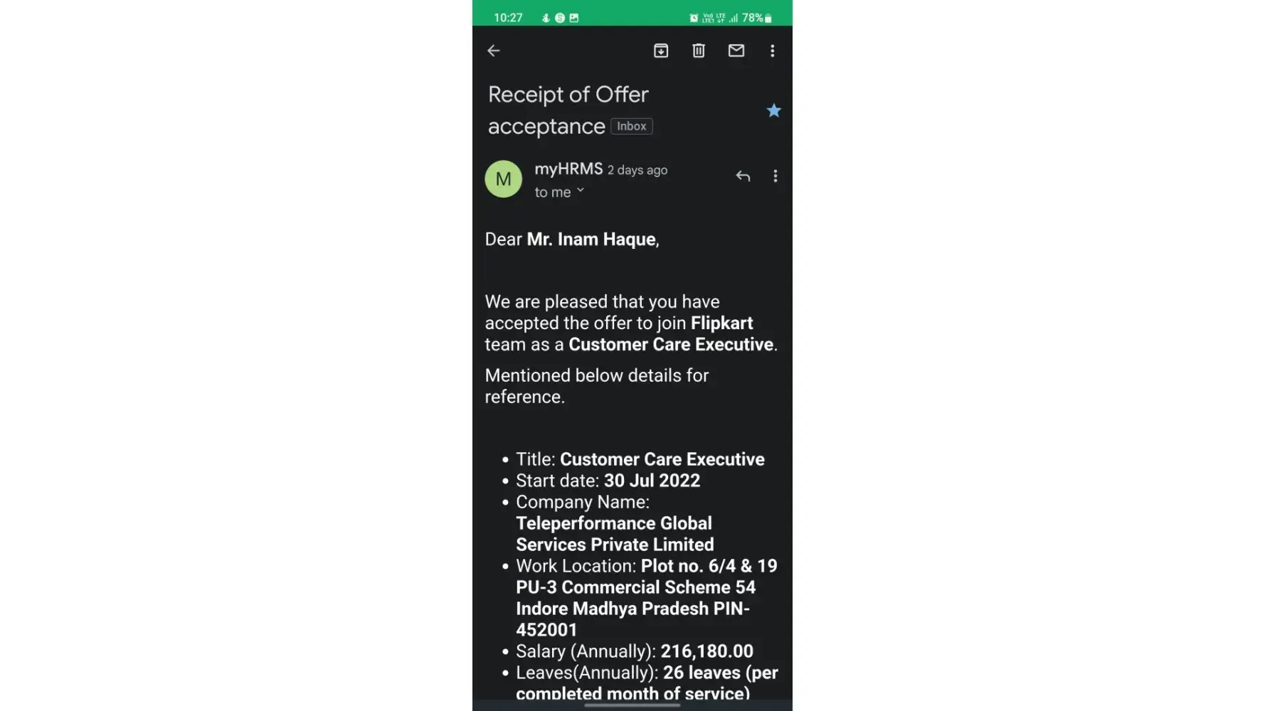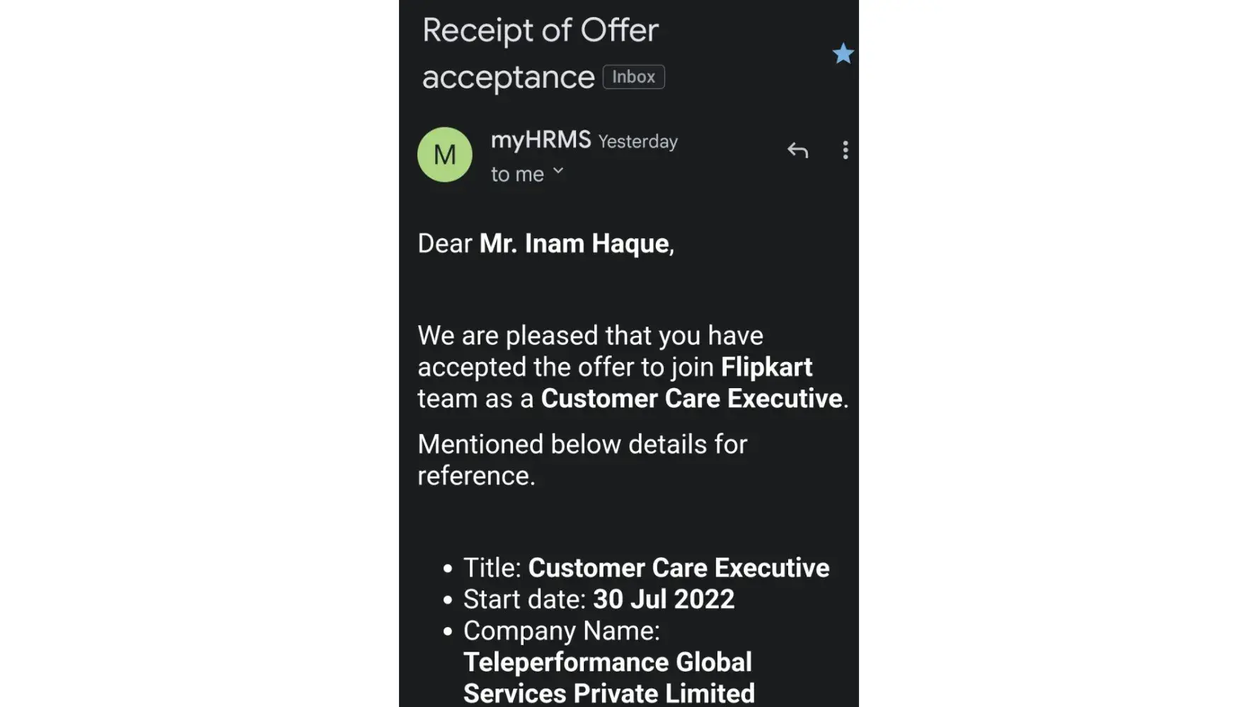 Desired outcome: I have proof when I joined Google meet after the end of interview I recieved the msg that you are slected congratulations how thay let me do all process such as system Check, on boarding, appointment letter and acceptance of offer letter.