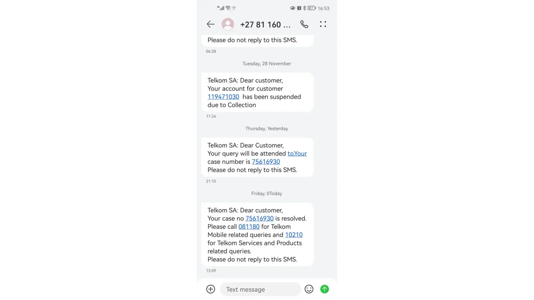 I would like to log formal complain about poor service that I received from Telkom, saying poor its understatement its very bad service my line has been cut off and it has been recurring issue now and it has block from taking phone from Telkom due this ongoing and unresolved issue, I have paid Telkom and for the past three months I have never missed payment in all my three contracts and I have been loyal customer to Telkom and I get treat like I am nothing lately, Telkom has hired none technical and unskilled people to their call centre lines who do understand what they are doing they lack people skills, soft skills no empathy or sympathy I have been calling Telkom to resolve the issue and I am not getting joy to this matter so now I am escalating this matter to this platform hoping I will get this matter resolved and go on with life it has been super frustrating when I have been paying for these service yet I do not get joy in using them because some where there is someone who does not do his or her correctly. I have been speaking to so many Telkom agents and some do not even take me serious as the client and they just say what they feel like saying if Telkom is handling its business to its clients like they are doing to me in no time there going to be more complains coming in. If my complain is not attend to I will use other platforms to get my matter resolved you see the mail trail to from Telkom agent including team leader on it.
