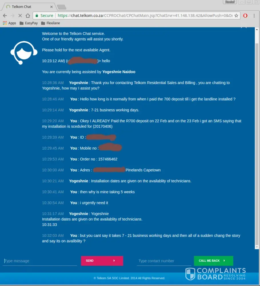 I ordered a line to be put in. They told met its going to take 7 - 21 working days. I then paid the R700 "Deposit" as the guy in the store called it. Only after i payed they tell me its going to take longer i payed the deposit on the 22 February 2017 the next day they send me an SMS saying my line will only be installed on the 6 April 2017, that is 28 working days. When i tried to contact Telkom with my Question on why it is taking so long i don`t get anything. On the contrary when i start asking they just disconnect the chat after i have waited a long time to get someone. Thy easily tell met to call the call center even if they know it takes forever to get someone on the other end in the call center. I screen shot the conversation. find attached.