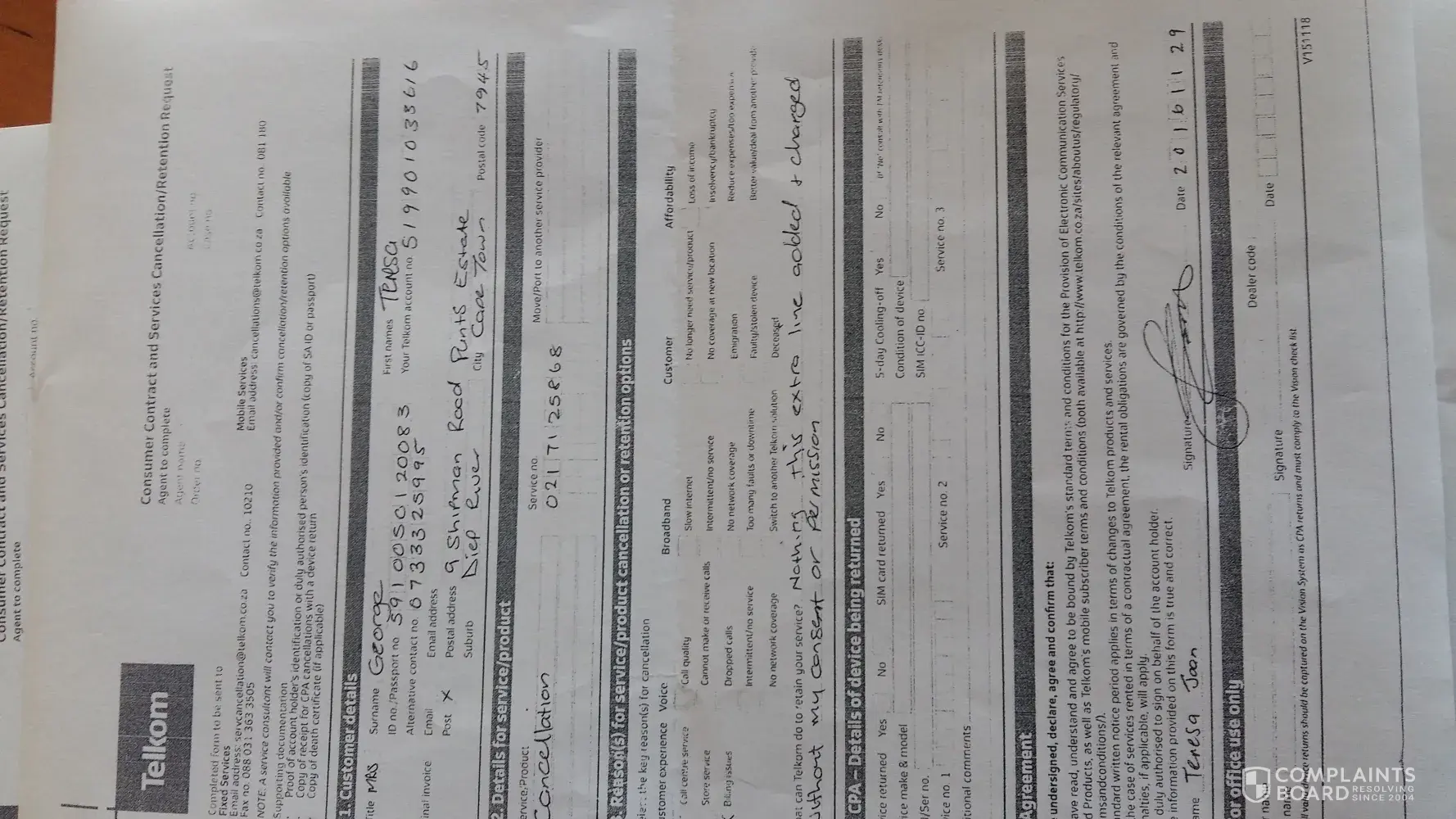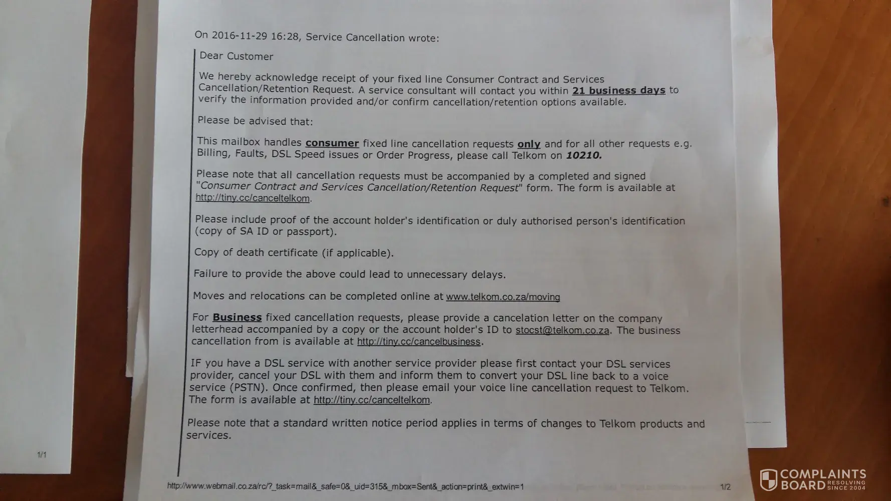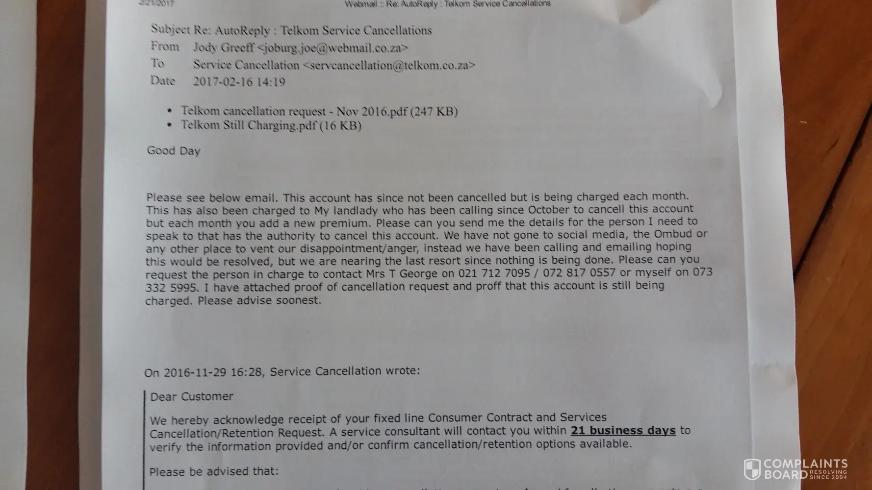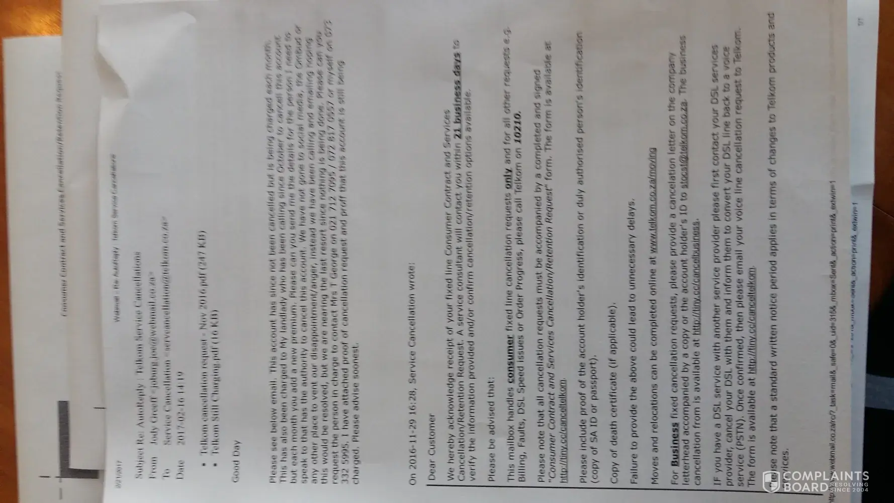 I emailed the Cancellation form with supporting documents for cancellation of my adsl service on 22nd Sept 2016. No follow-up communication from Telkom. I phoned in November as I was still receiving bills.
