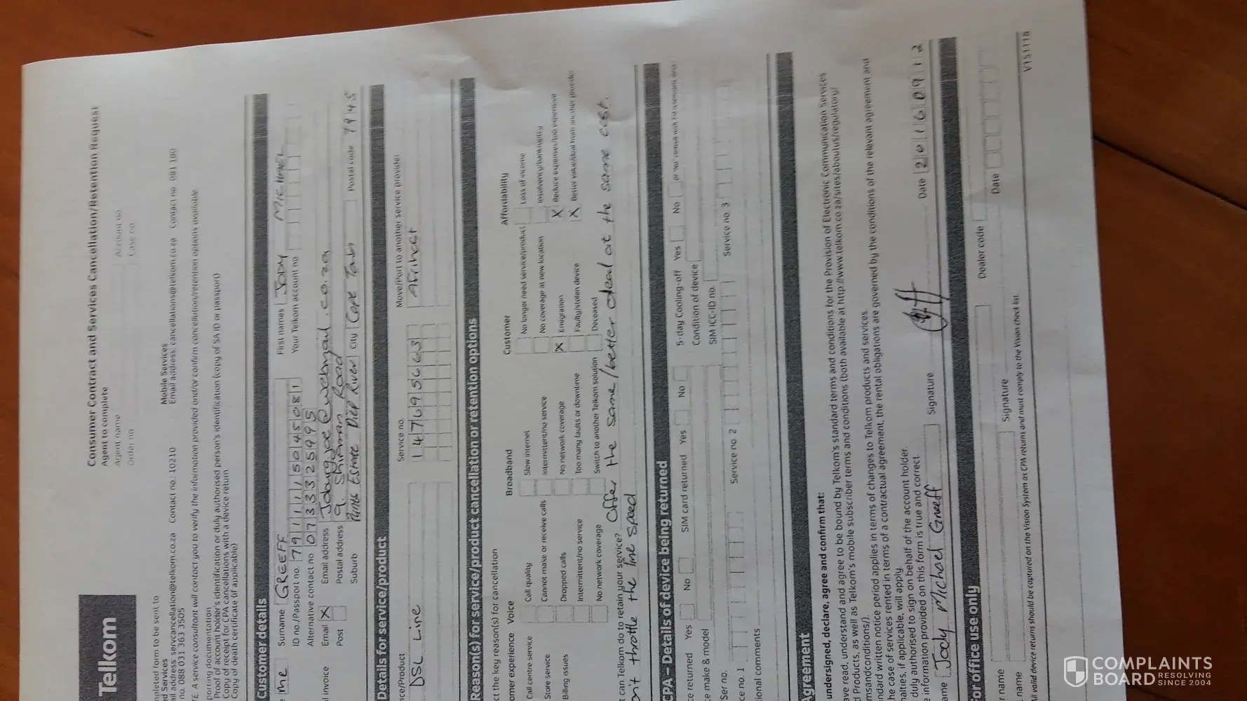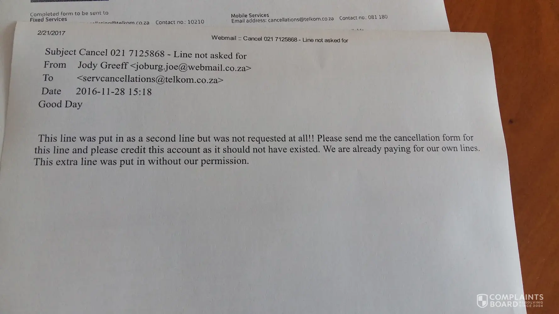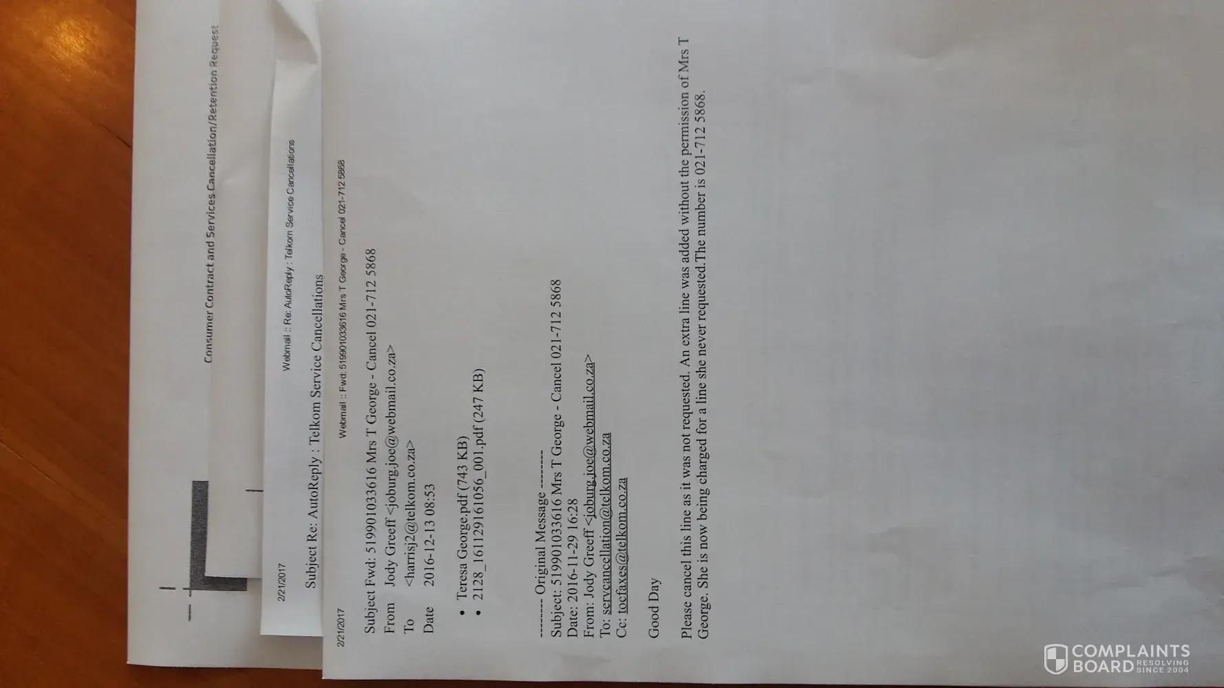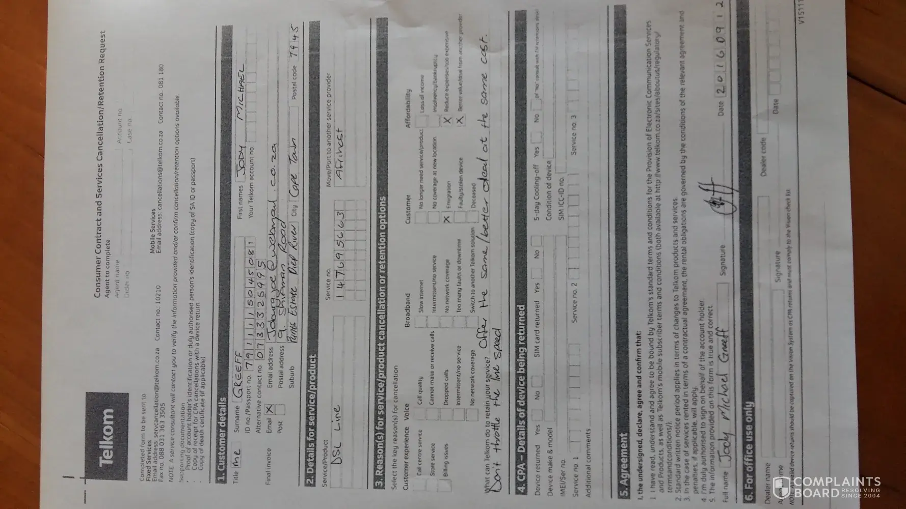 I emailed the Cancellation form with supporting documents for cancellation of my adsl service on 22nd Sept 2016. No follow-up communication from Telkom. I phoned in November as I was still receiving bills.