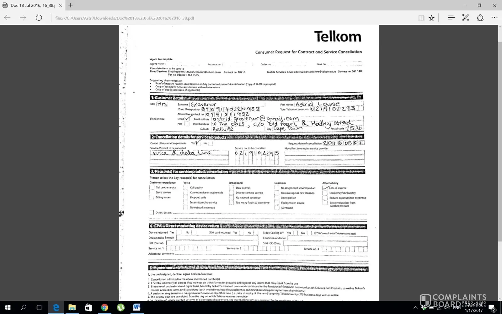 We completed a consumer contract and services cancellation request form and sent it through to [protected]@telkom.Co. Za and [protected]@telkom.Co. Za