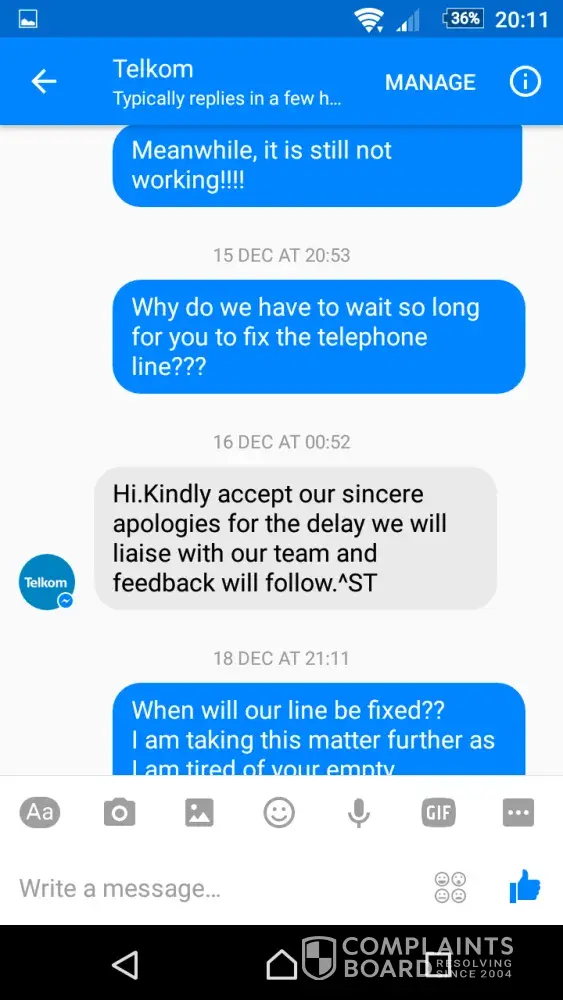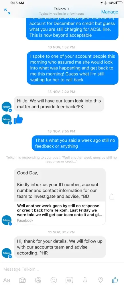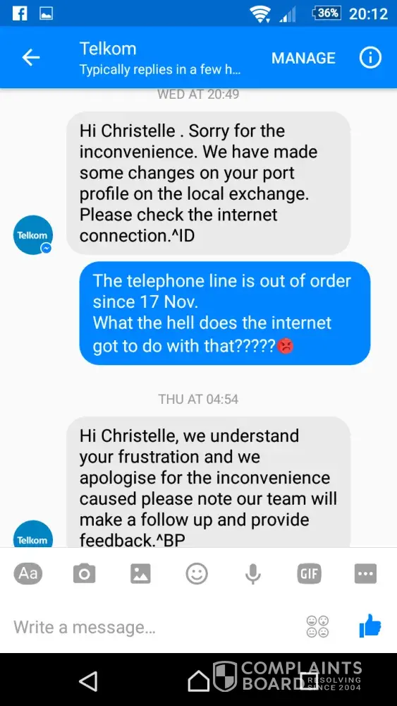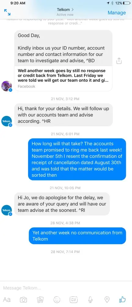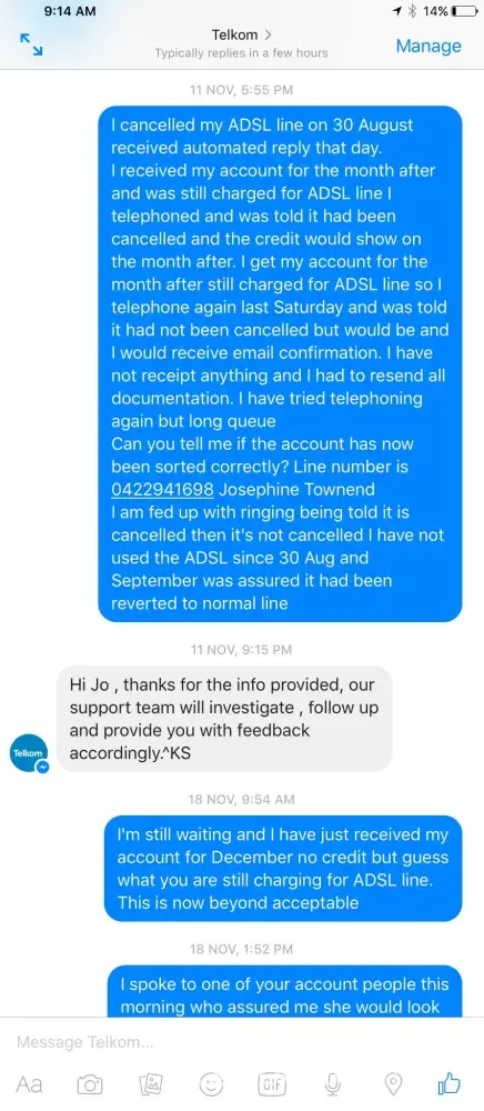 There are a large number of the exact same type of complaint online, without any response from Telkom.