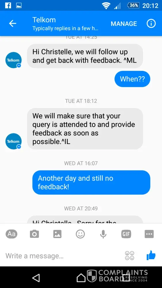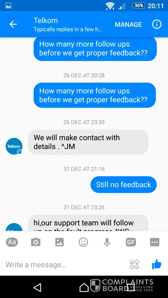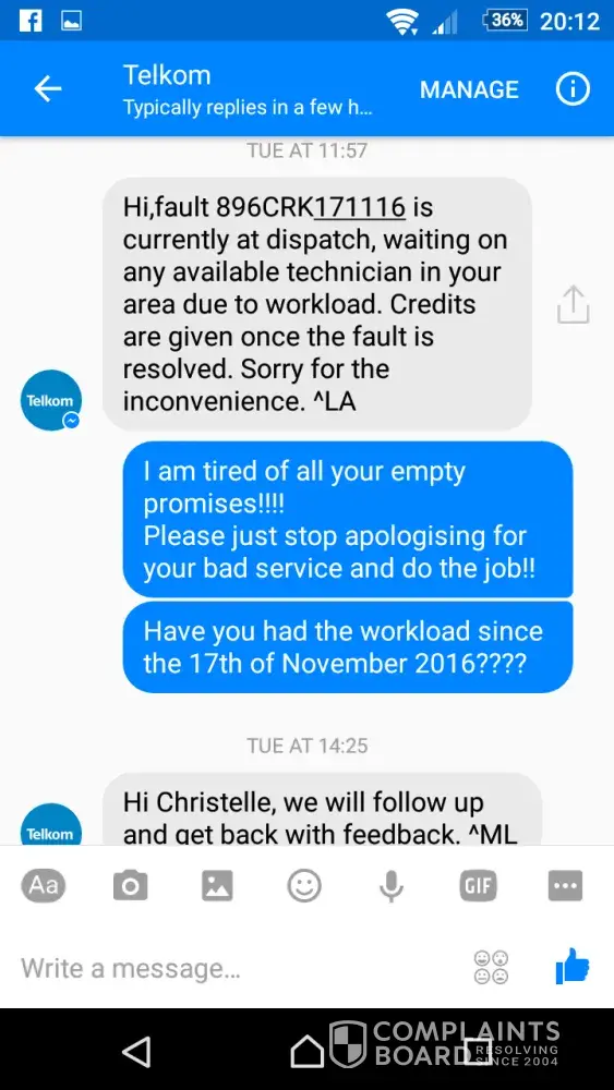 Everytime we follow up with Telkom, we are advised that they give feedback. We never get feedback and they will have the same excuse everyday.
