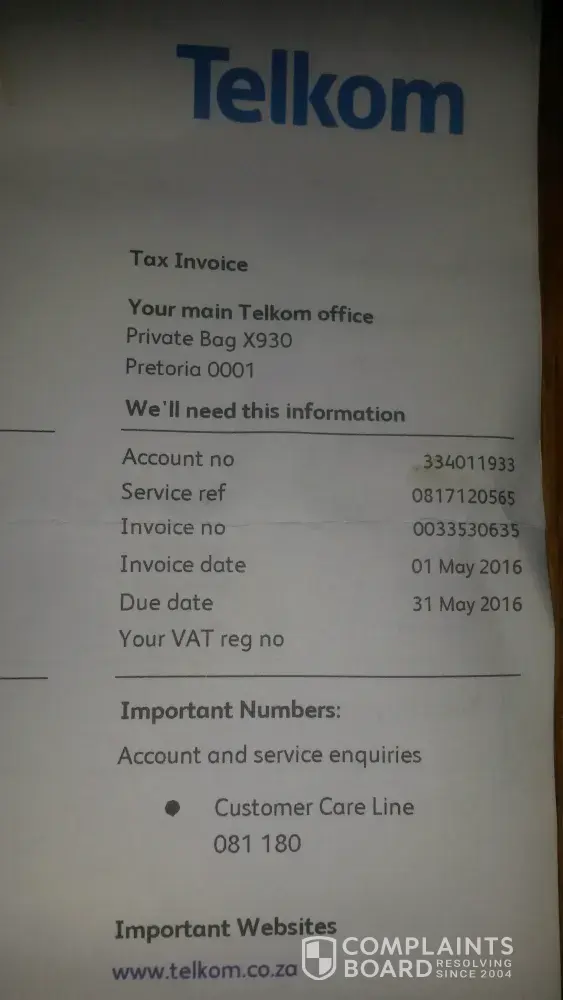 I have been liaising with a number of people at Telkom since July 2016 and to date the matter is not resolved.