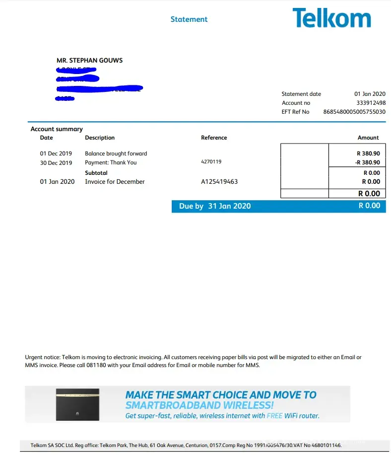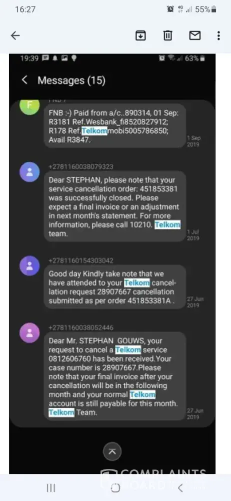 After a couple months the final amount was deducted (R178deduction attachment) and in Dec 2019 Telkom started to deduct The full instalment again R380.90 (December2019 attachment). I had to go into the bank to create a stop order to stop Telkom from taking money from my account.