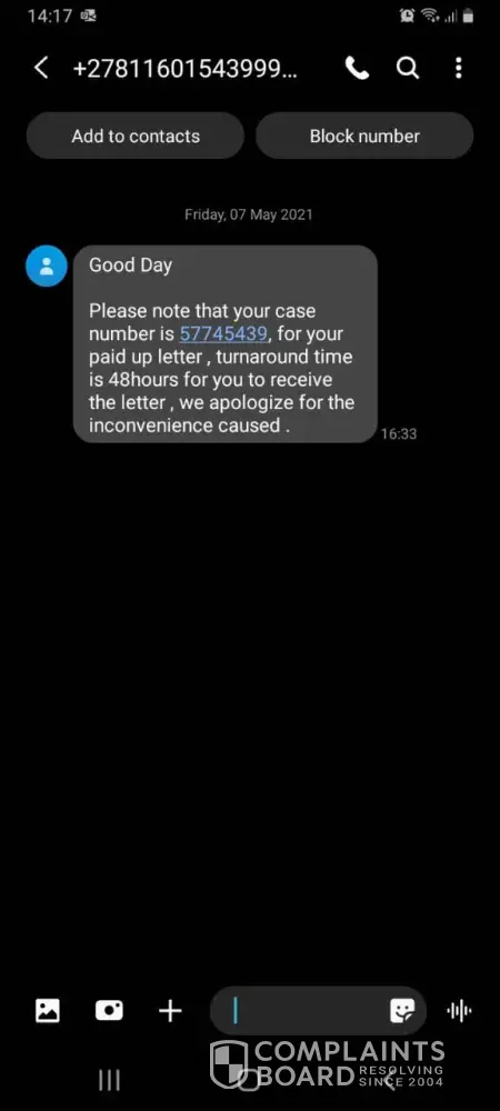 Vusikhaya Nquma in the Executive Customer Relations department, ensuring me that they would again contact me with 48 hours. Its the 13Th May today and still I have received no feedback from her or any other agent.