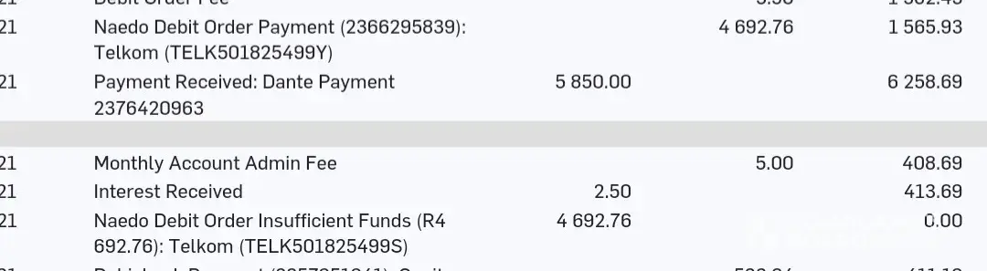I reversed 2 of the R40.00 deductions because I did not have money and this deduction was actually never signed and agreed upon...Telkom then in turn charged me R210.00 per debit order reversal and still handing me over to Nu Debt Management!