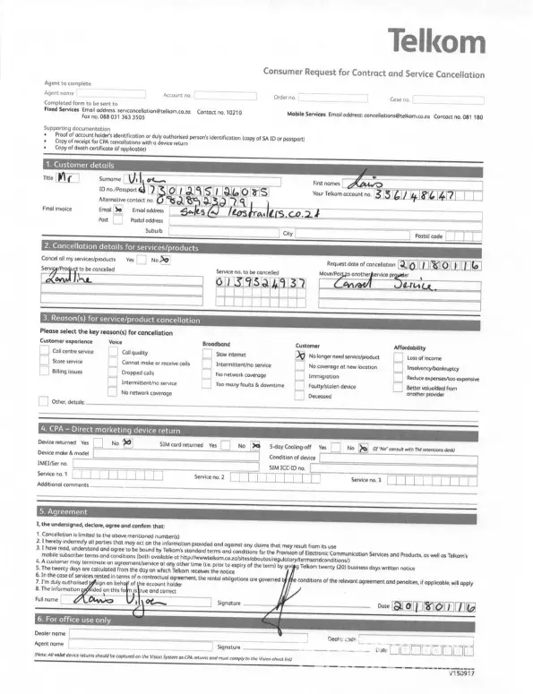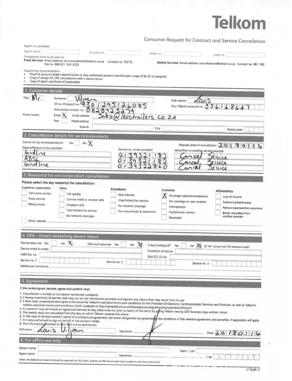 5. [protected] relating to Request for cancellation of service [protected] logged 18 Aug 2018 - This is a mobile number for LTE services which I never received, so requesting Telkom to cancel it.