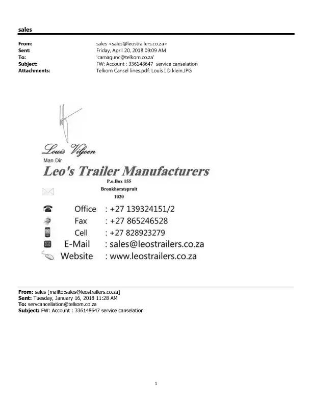 1. [protected] logged 31 October 2018 - Please cancel all services we have with Telkom with immediate effect.