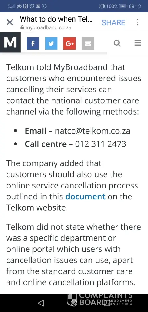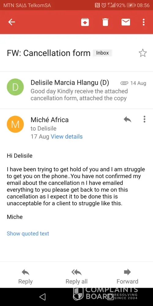 Attached you will find the statement from August 2017, the cancellation form, a new cancellation form, emails that we have sent on various dates, to date no response from Telkom. Whenever we contact Telkom they tell us that they have not received the device from Westgate branch. The manager, Ruben Kgopleng has assured us that he has sent though the necessary documentations.
