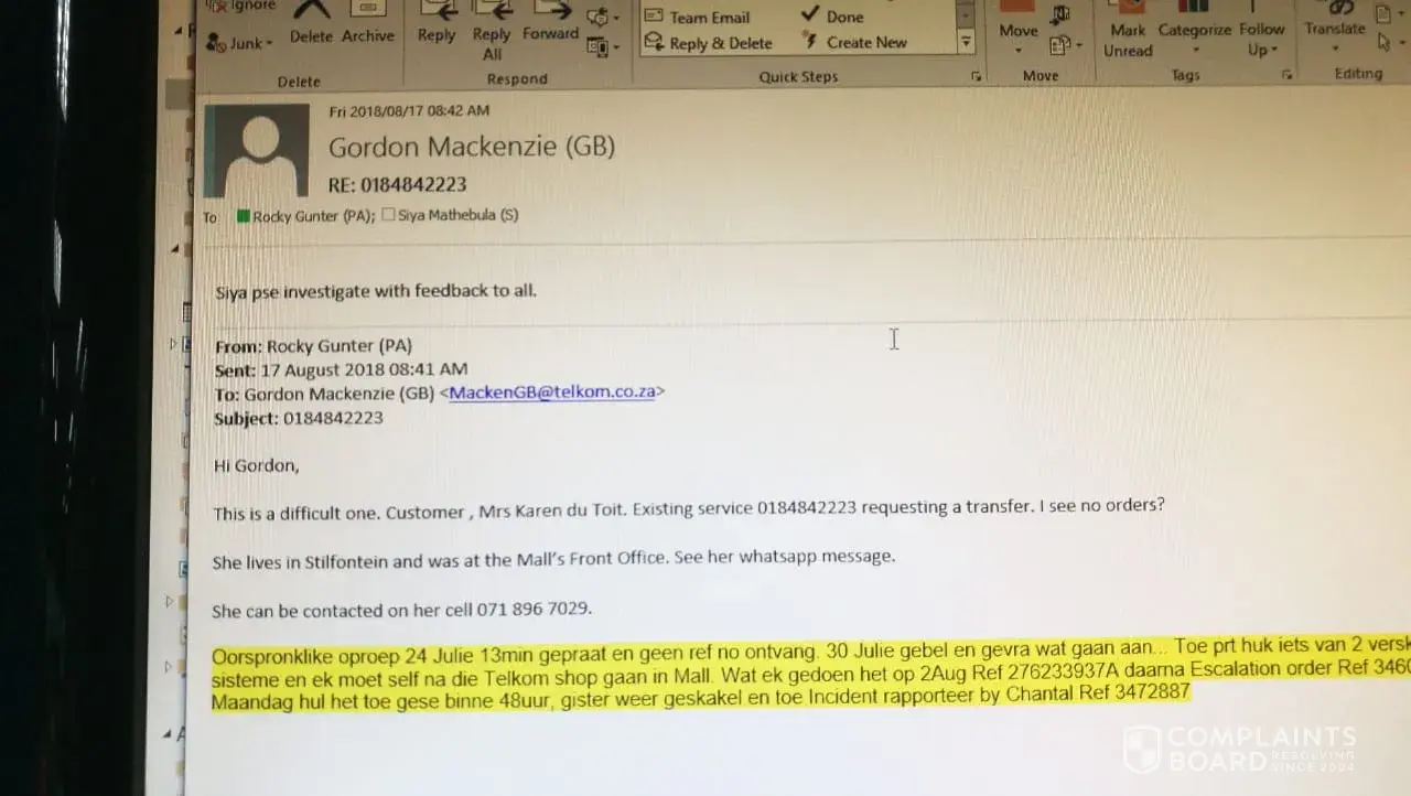 On 19th February 2018 when I had still had no satisfactory response, I contacted Telkom telephonically again.