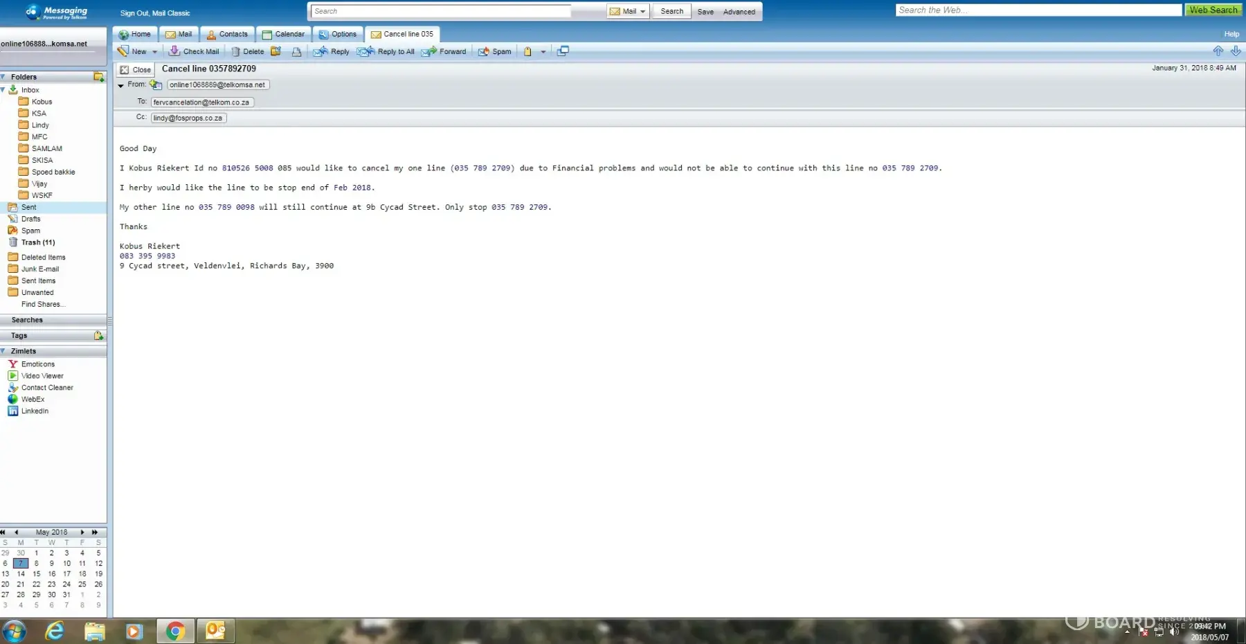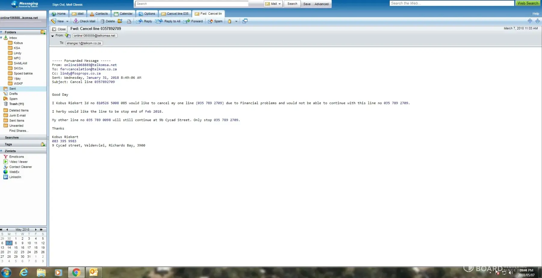 On the 31 Jan 2018 i send and email to telkom to cancel my telkom line [protected] end of Feb 2018.