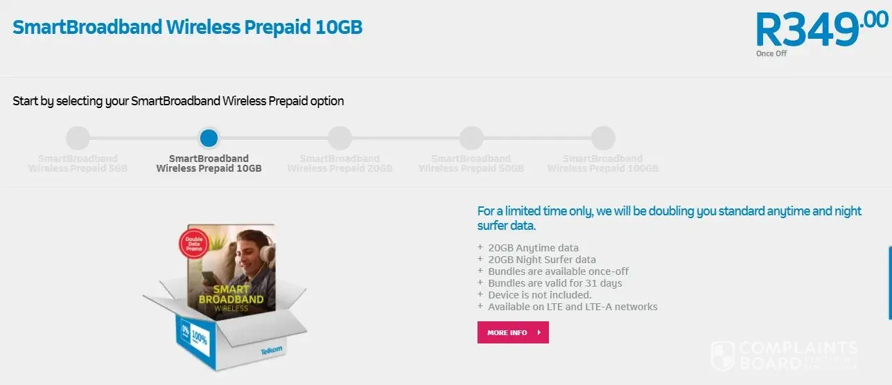 on Monday 30 April 2018 i bought a telkom smart broadband 10gb + 10gb on prepaid and as per special on the website i was supposed to receive an extra 10gb + 10gb as a doubling bonus which has not happened and samantha a chat agent on the website claims its only available to contract customers but the website says differently can the issue be promptly resolved by providing my data.