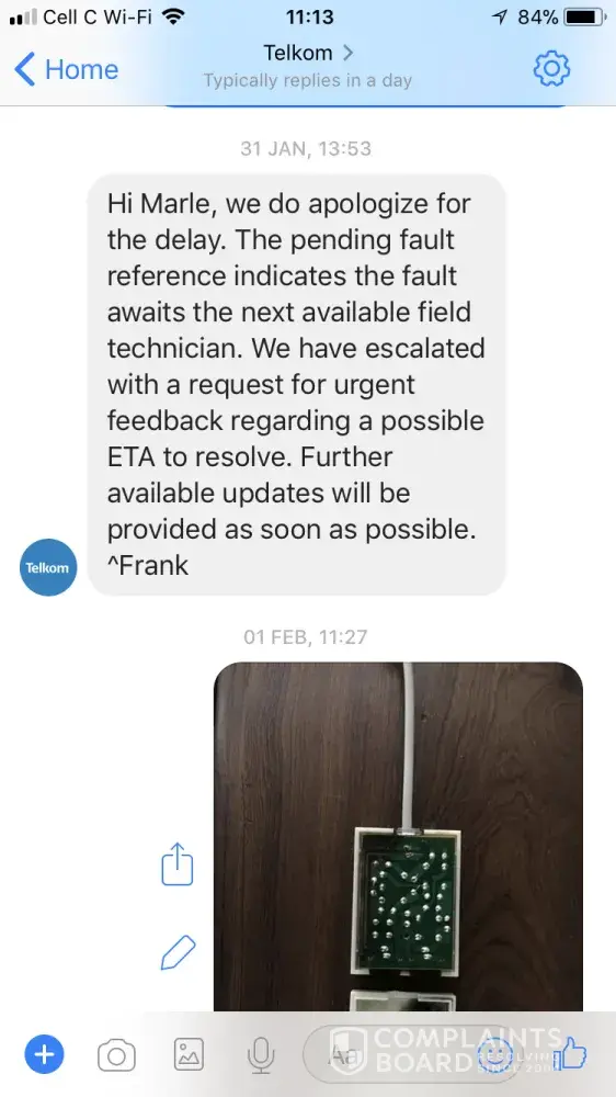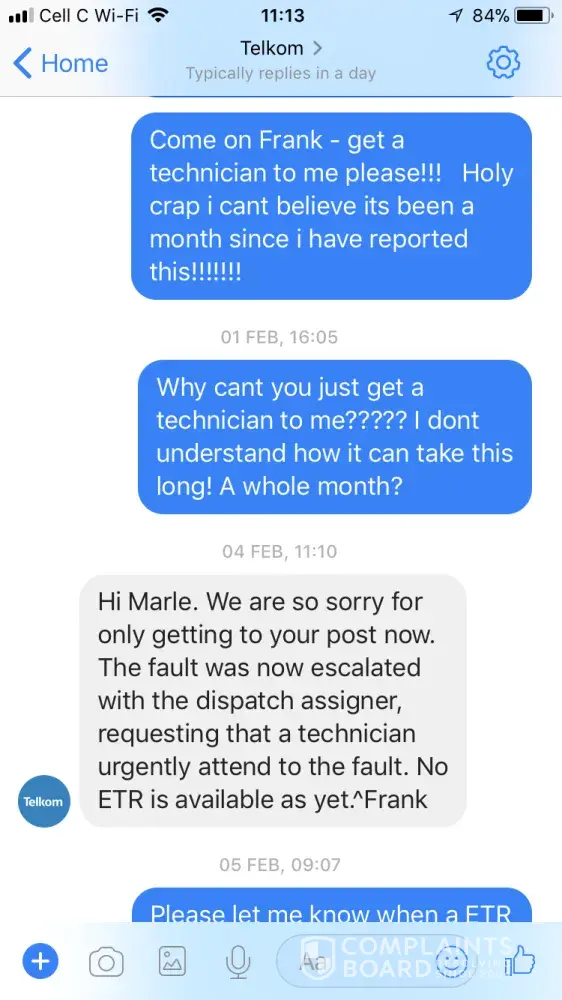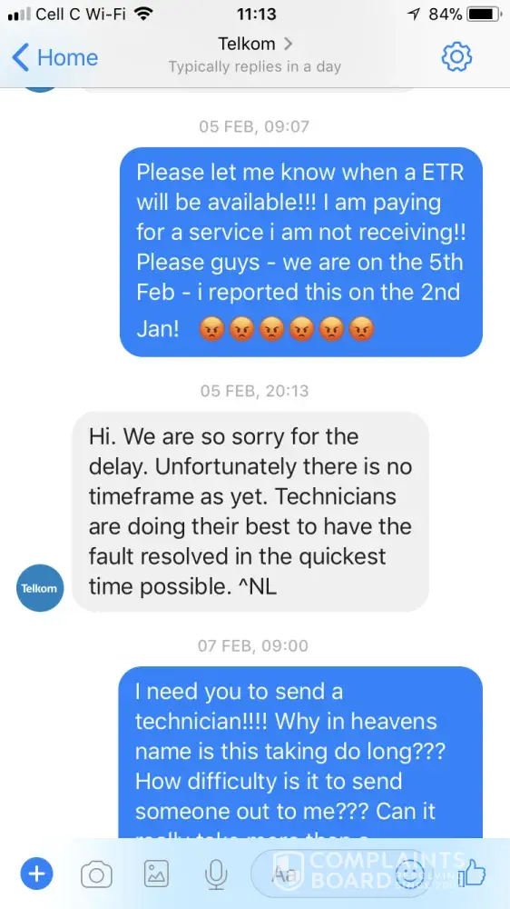 I received an SMS late on 4th February telling me to be at the address from 08h00 to 16h00 for installation. I replied that I need advance warning as I am not at the premises normally and have an office to run at a different address.