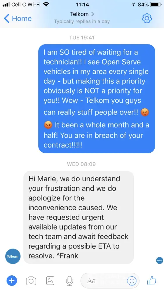 It would have been very satisfying if Telkom as a whole actually took the time to empower their staff (especially management) in a way that they can solve problems and deliver a great customer experience, and not find the easy way out to blame customers for what seems to be very technical for them to explain or understand and leave us as customers unsure about what is going to happen next and more frustrated.