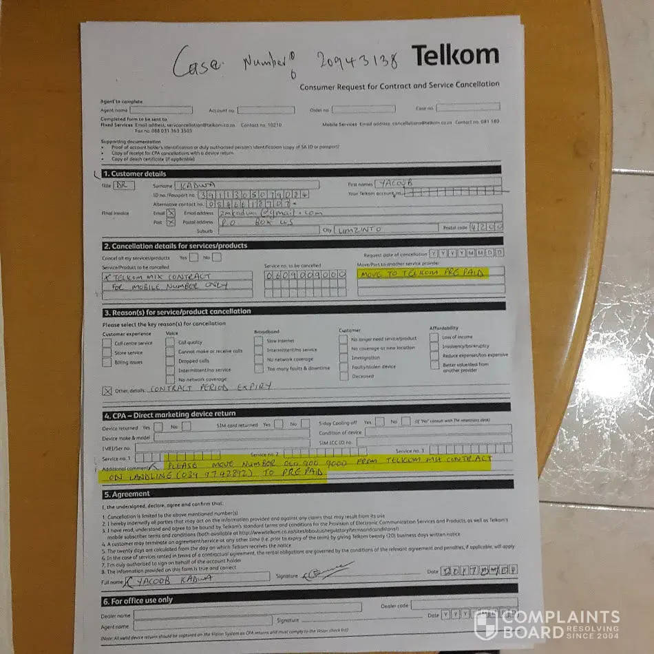 Now I was left with another problem. My contract was cancelled, but my number was not put onto prepaid, which was the clear instruction on the cancellation form as per the advice of the consultant at the Telkom store. On the 4th August I called into the call center and was told by Sandy that my contract and number was cancelled, and my number is inactive. She raised an urgent request to have my number re-instated on prepaid, with reference number [protected]. She escalated this request to her manager.