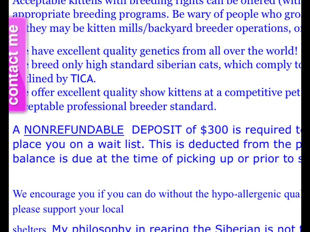 For an HONEST refereal for me you are welcome to contact OTHER BREEERS, including NIKARL SIBERIANS in Ohio. This is only one complaint out of WHAT? I do not request a deposit BEFORE visiting, but As any other breeder I will not reserve your kitten unless you have a deposit paid. I have been breeding since 1978.