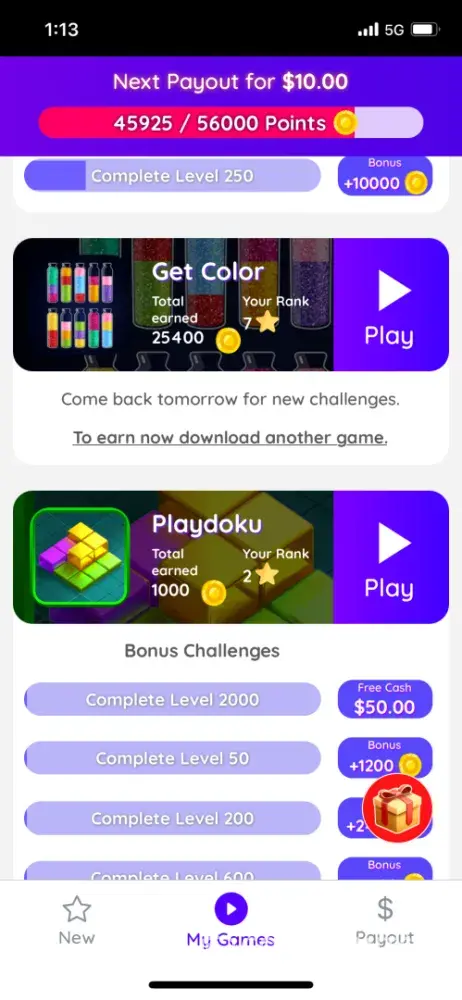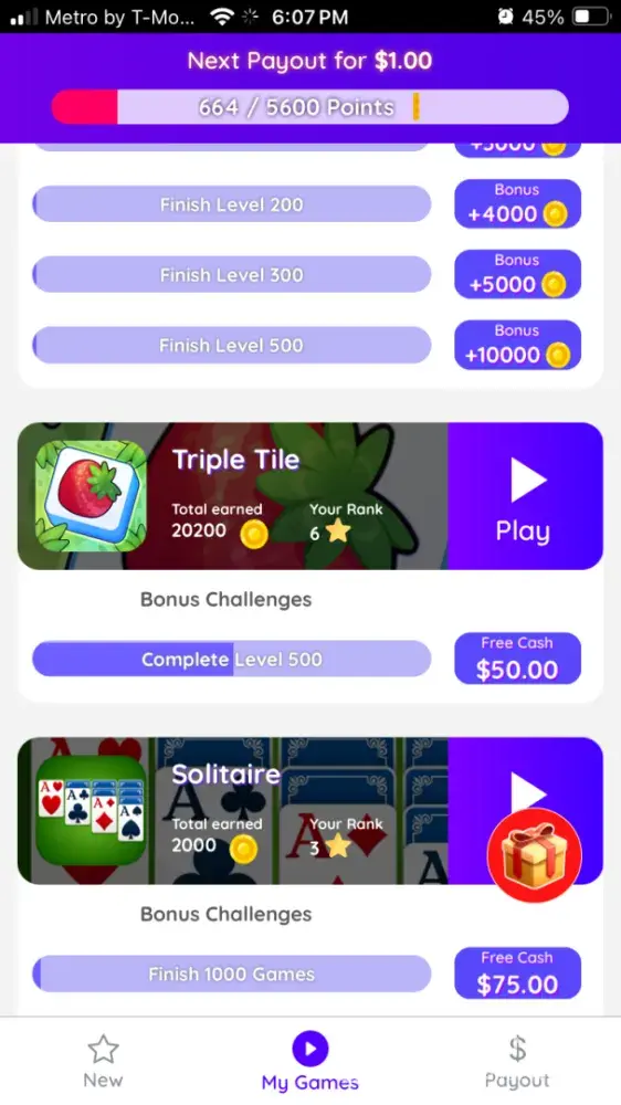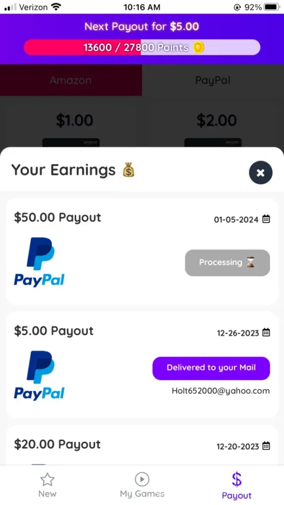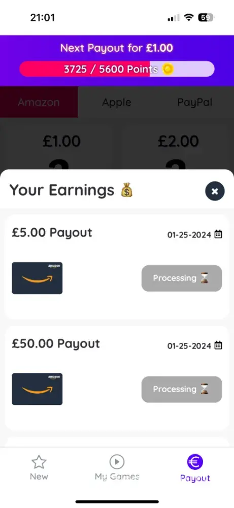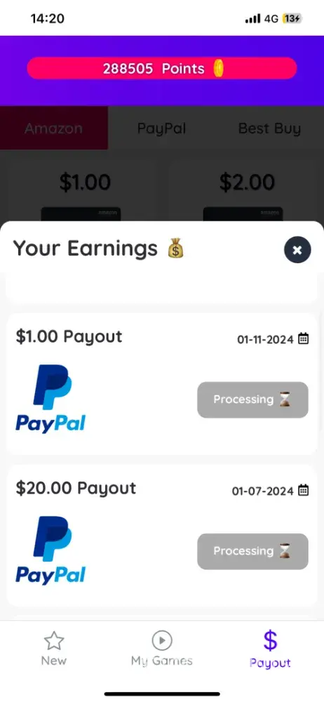 Ok, first the positive- This is a cute little app and the many of the game characters and app graphics are adorable (ironically the cute little star emoji with the heart glasses is what persuaded me to leave a review lol). I made 4 dollars within a couple days and cashed out via Amazon gift and my payment arrived in less than 10 minutes (honestly the fast payout is the best thing about this app, I’m my opinion). However if you download this app you’ll have to use several apps to even get a few dollars if you don’t want to spend any money on upgrades/prizes in the game. One example of this is the Dice Dreams game where you make the equivalent of 1 dollar after advancing to Level 5 and there’s an “offer” on this app’s homepage to get 3 dollars for spending money in the Dice Dreams app. Like I said, if you’re ok doing that then that’s fine but otherwise, no offense, I’m personally disappointed with this one.