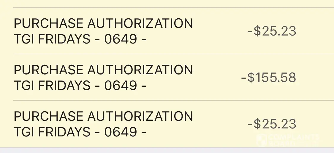 I called and spoke with the manager, Aundra, who said she would fix it by 4:00am when the checks finalized for the day. It was not fixed so after speaking with my bank, I called TGI Friday's again and spoke to another manager, Tim. He told me they couldn't do anything about it until Tuesday when the checks close for the week. That is almost an entire week that I don't have the money to pay bills with. My original bill was for $25.23 (which is incorrect because nobody at the table ordered nor drank an iced tea and Mary, the waitress, agreed to remove the $2.99 charge and then "forgot" to do so). I was charged $25.23, $25.23 again, and $155.58.