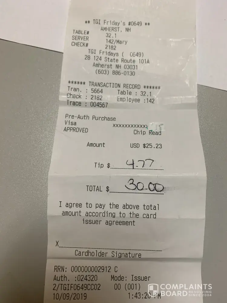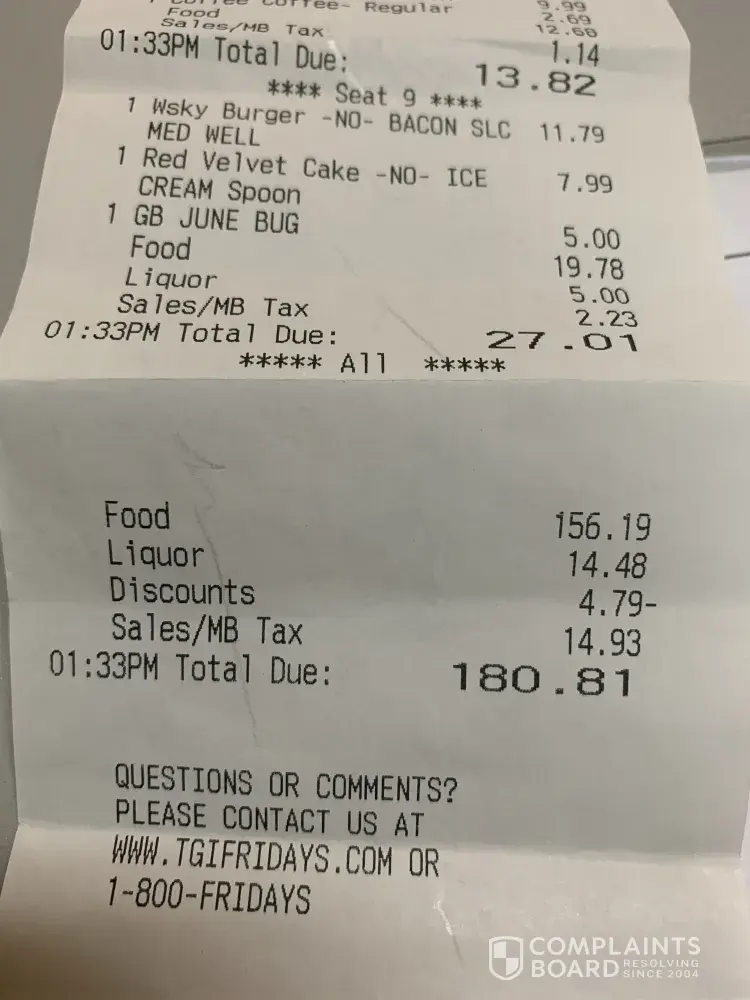 $180.81 was paid in cash, along with several tips added to that. I tried to call corporate after the managers in Amherst were not much help - but their recording says to contact them on their website, even though their office is open Mon-Fri 9am - 5pm. There was no option that I could find to talk to a live person.
