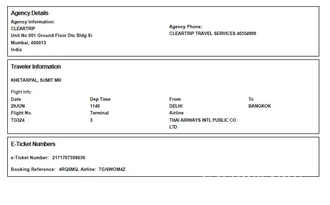 1) Flight from New Delhi to Bangkok on 29th June 2023: