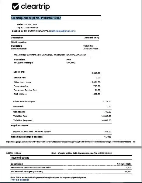 My name is Dr Sumit Khetarpal, M.B.B.S, M.D (Internal Medicine), Director- Deptt of Internal Medicine, Max Super Speciality Hospital, - Mohali, India. I had booked Thai AIrways flight from New Delhi to Bangkok for 29th June 2023 to attend the IPPA (International Panel Physician Association) Workshop, in Bangkok, Thailand.