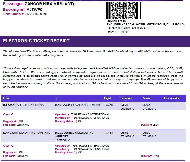 My wife (thai)and my daughter (less than 6 mo old) have traveled with Thai airways on 15 th Aug 2019, 00.15am from Bkk to Melb via TG475.