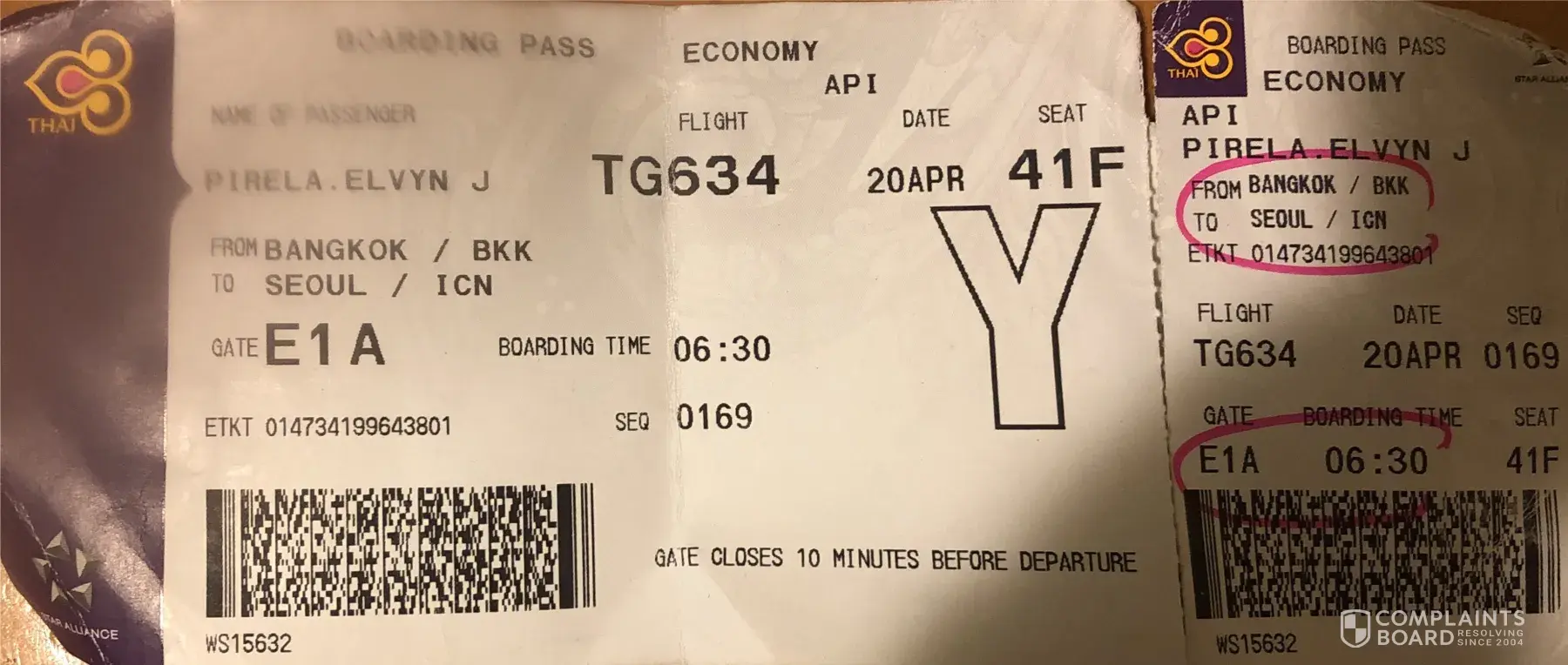 compensation for flight tg634 from bangkok (bkk) to seoul (icn) on april 20, 2019