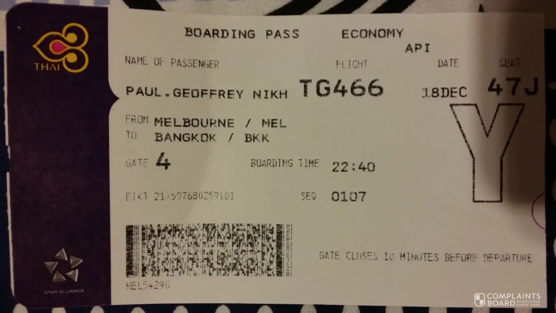 I have traveled with Thai airlines on 18/12/2017 from Melbourne to Hyderabad (ie Melbourne to Bangkok - Bangkok to Hyderabad).