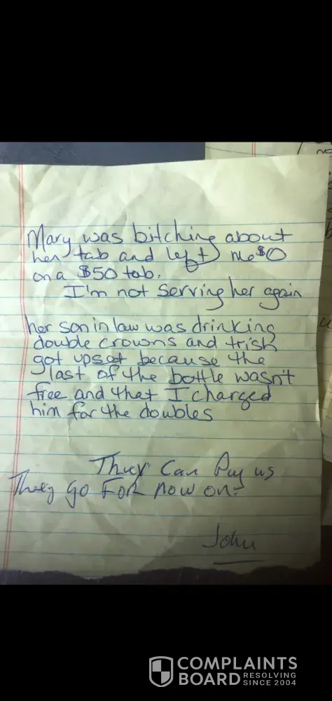 My mother is 76 years old and is a wife of a deceased Lt Kernal. We have been going to the American legion post 174 for the past 14 years. Never had a problem before till now. A fairly new bartender has been overcharging my mother, who, my mother, never said anything about it. One day they asked her if her bill was ok. She said no, she had 2 chips, and was charged for the 2 drinks she had chips for. She has been harassed ever since. The letter that I am attaching was written by that bartender. First of all,. My mother did not [censored] like the bartender said. And I did not get upset about the last drink in the bottle. I simply asked her if the last shot was free, because in the past, it has been. This lady refuses to wait on my mother when she goes in there. My mother would tip her, if she earned it. I am also being harassed. I was in there one evening for about 15 min. A bartender gave me and my friend a nasty look as soon as we walked in. She asked me to leave, apparently for talking. I started out the door, and she started coming after me. I told her about 5 times to not touch me, and to stay away. I was leaving like she asked. Legally she has no right to come after me. Everything is one sided. They never ask the other side of the story.
