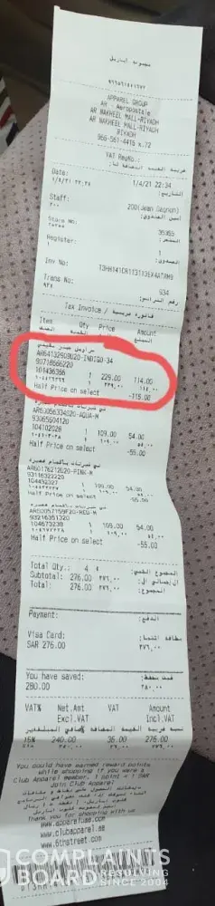 Firstly want to mention about a jeans offer when i entered the store there was a tag of 99 SAR on the Jeans, but when i selected the jeans and went to the counter they charged me 114 SAR when i asked the sales person couple of times there was a 99SAR tag he said no sir it's 114 SAR and the tag in red was removed already which is in attached picture.